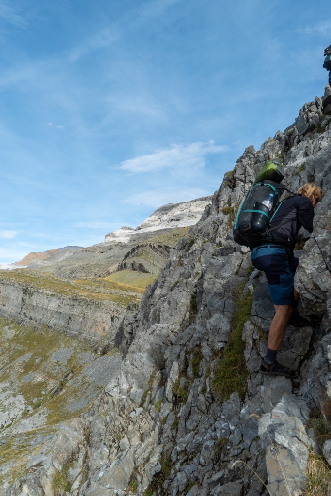 Après un mois et demi de baroudage en France, il était plus que temps pour les Riders de sortir de leur zone de confort et de débarquer dans un pays non-francophone. Jusqu’à présent, les affaires courantes de la vie quotidienne pouvaient être confortablement expédiées en français ; cela nous rendait certes bien service au moment de faire la tournée des magasins de vélo à Toulouse ou de demander si la boulangerie du coin faisait des formules midi, mais il faut reconnaître que niveau dépaysement, on avait vu mieux. C’est pour cela que nous nous réjouissons d’enfin traverser la frontière espagnole par le col du Pourtalet et de prendre notre premier Chocolate a la Taza. La traversée est-ouest des Pyrénées françaises a laissé des traces dans les organismes et c’est avec un certain soulagement que nous laissons nos bécanes à quai pendant 3 jours pour faire un trek dans le parc naturel du Monte Perdido. Nous partons chargés comme des mulets (pour changer !) : un trek en autonomie complète requiert d’avoir sur soi tout l’attirail du baroudeur. Nous emmenons avec nous affaires de couchage, doudounes et vestes de pluie (ou sacs poubelle pour 2 Riders) ainsi que de la nourriture en quantité.
