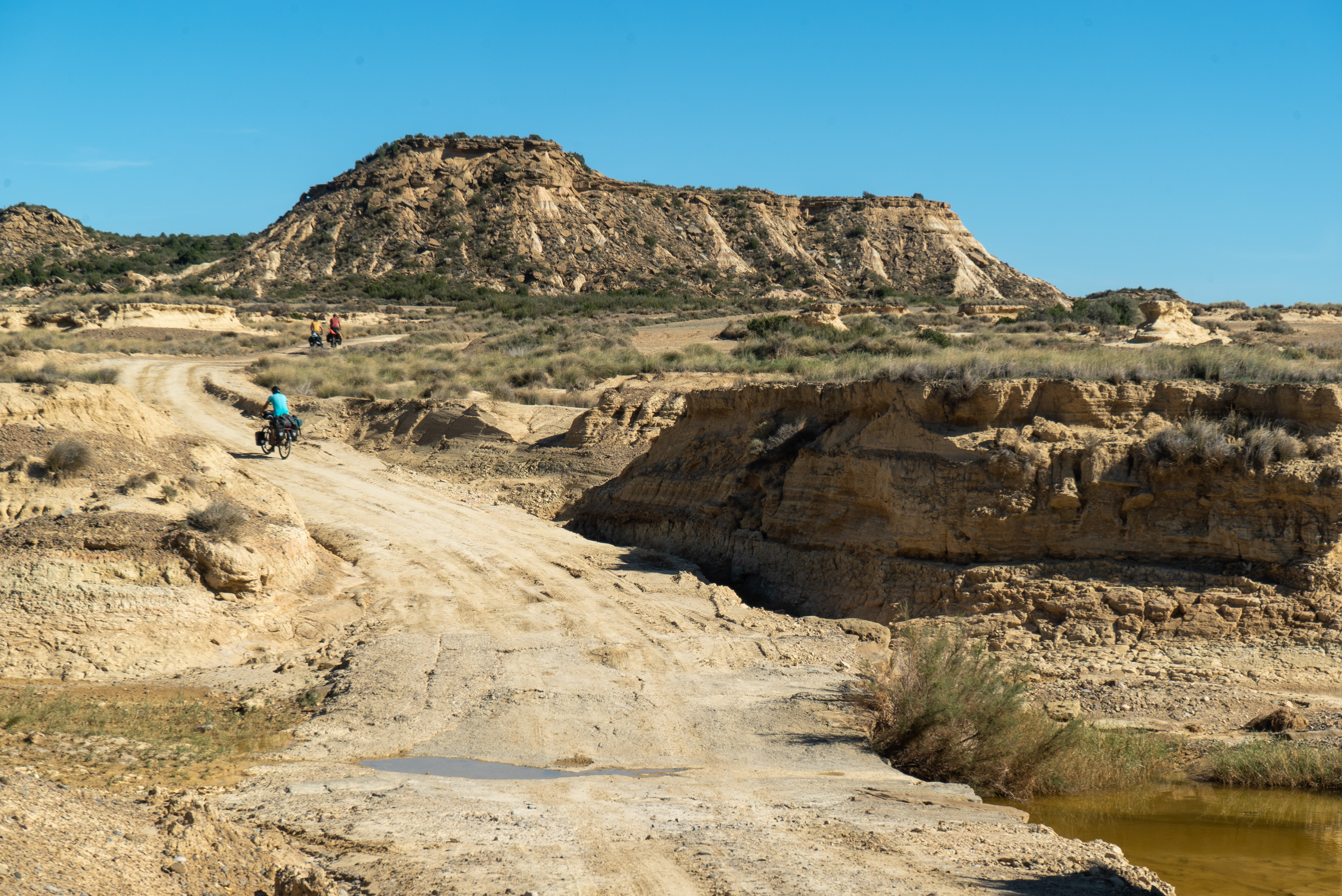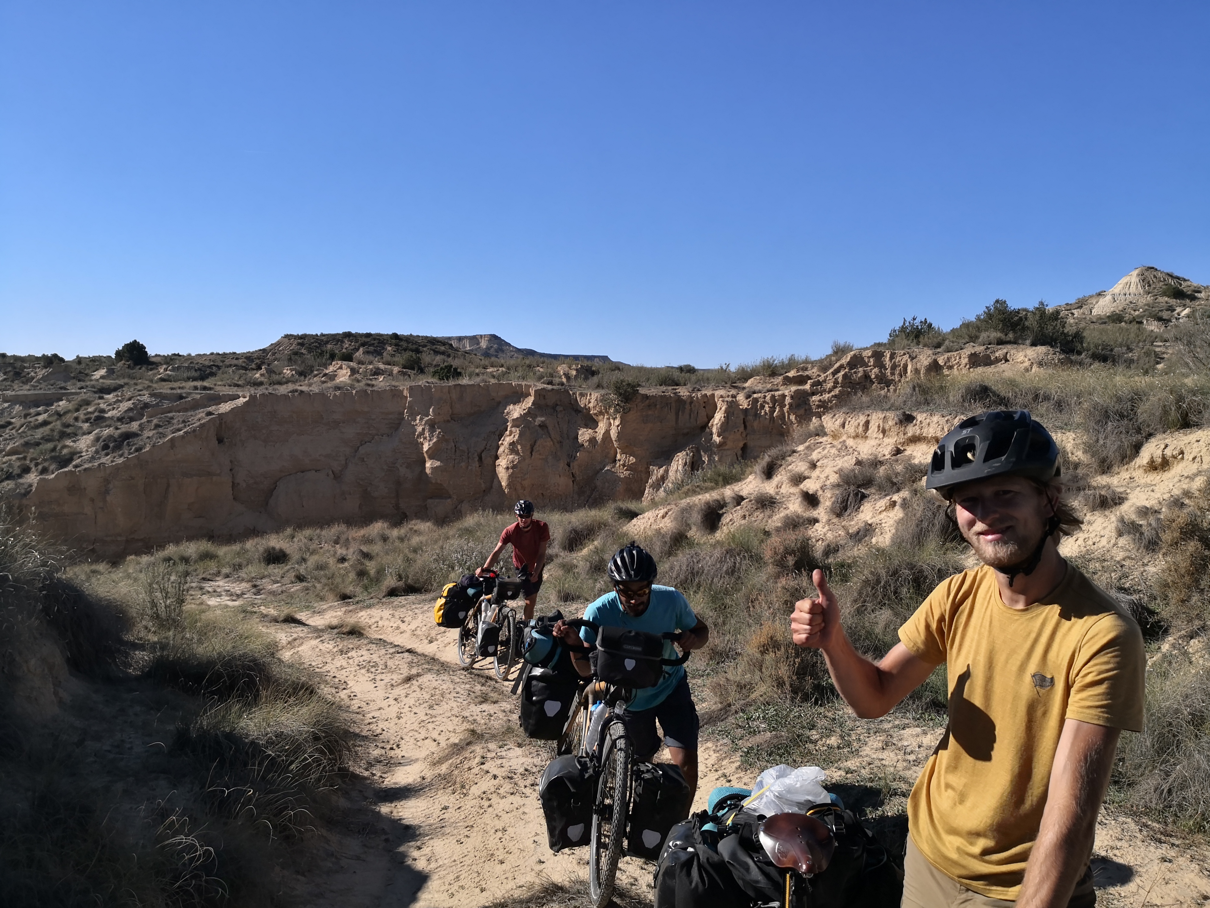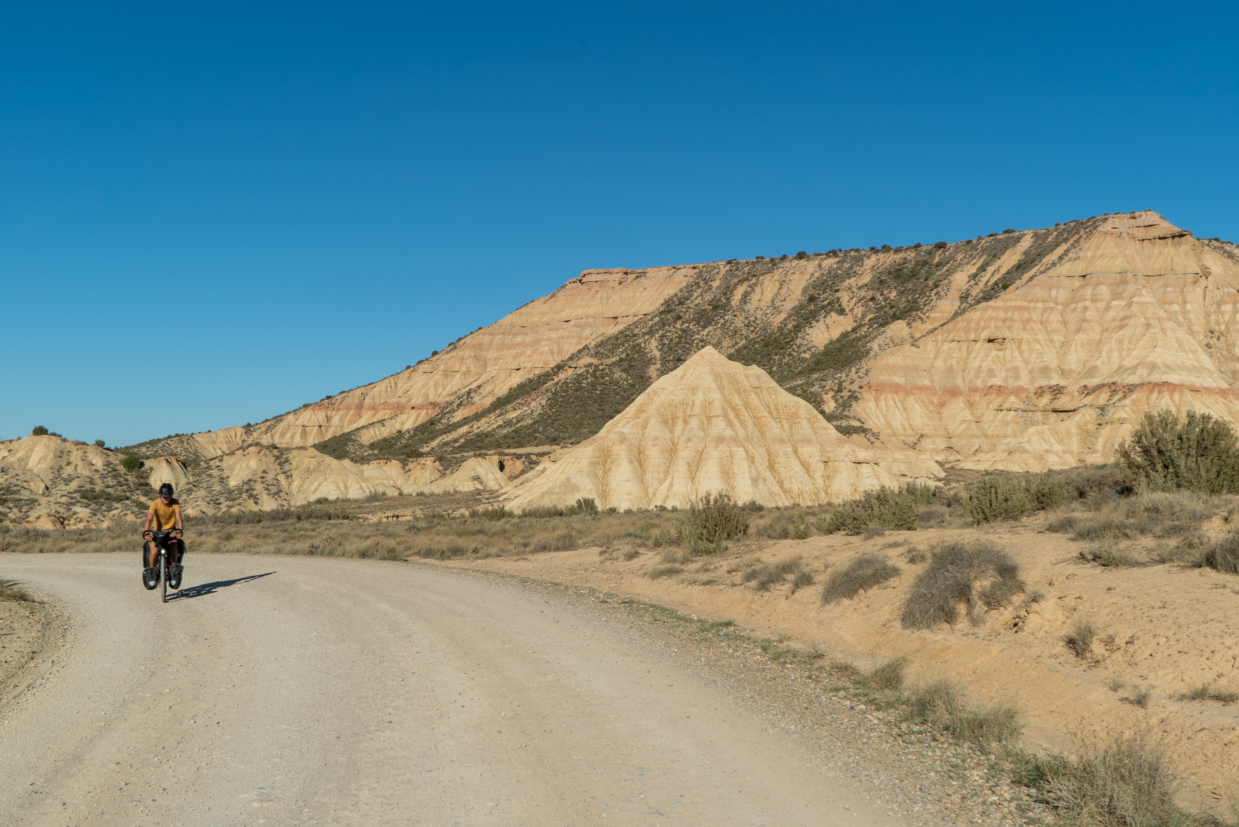 Les Bardenas Reales forment une réserve naturelle dont les paysages font penser à l’ouest américain. D’ailleurs, certains Westerns ont été tournés sur place – en particulier certains Westerns « Spaghetti » tournés dans les années 60 et 70. Le parc naturel se situe à l’extrême est de la Navarre et borde donc la frontière ouest de l’Aragon ; pour y arriver depuis Huesca, il a fallu pédaler avec un vent de face continu sur une centaine de kilomètres, ce qui a considérablement affecté le moral des troupes. Heureusement que les paysages des Bardenas en valent la peine, et que le parc se visite parfaitement à vélo, même si les routes ne sont plus goudronnées !