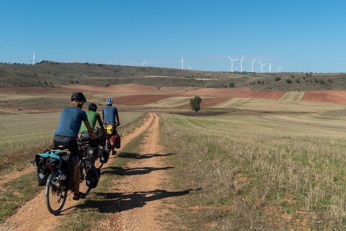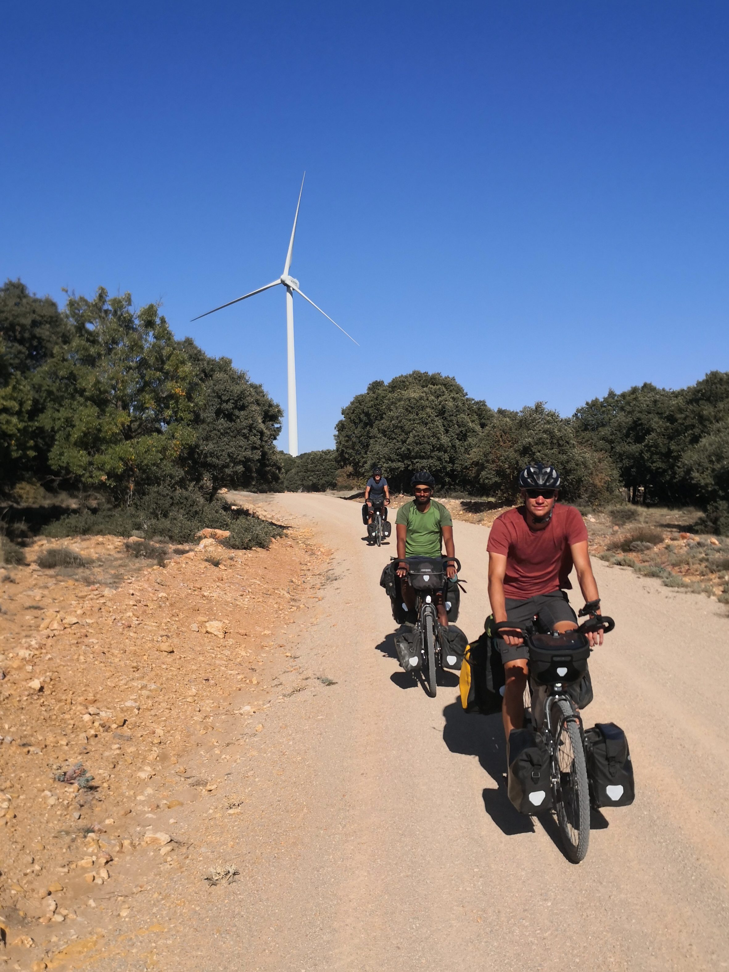 Suite à cet incident, nous descendons la vallée de l’Ebre en direction de Saragosse. Nous atteignons la ville pendant le week-end de la fête nationale et nous sommes hébergés par Daniel, qui en plus de nous offrir le gîte, fournit à Antoine un disque de frein de remplacement. Daniel est aussi un cycliste accompli et fait preuve de beaucoup de patience pour nous expliquer, en espagnol, par où passer pour rejoindre Madrid à vélo. Nous entrons alors dans l’Espagne profonde : des champs (pas toujours cultivés) à perte de vue, une autoroute qui balafre le paysage, des routes très secondaires non-goudronnées appelées Caminos et des villages quasiment déserts qui n’ouvrent leurs restaurants qu’à des heures bien précises (indice : ces heures ne correspondent en général pas à celles où 4 Riders ont la dalle après avoir pédalé pendant deux ou trois heures).