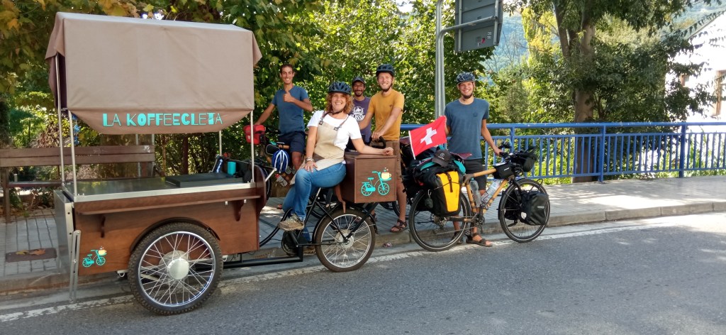 Autre situation d’apprentissage accéléré d’espagnol : nous avions fait venir quelques colis en poste restante à Ainsa, et le jour de la livraison, la société qui s’occupe de l’expédition nous envoie un mail nous informant que « les colis n’ont pas pu être livrés ». Notre premier réflexe est d’appeler la poste d’Ainsa et de leur demander un peu plus d’explication. Mais allez expliquer, au téléphone et en espagnol, votre problème à une interlocutrice qui fait de son mieux pour vous aider mais qui ne peut pas apprendre l’espagnol à votre place ! Après plusieurs essais, nous avons enfin le fin mot de l’histoire : il est impossible de se faire livrer un article en dépôt de poste si l’article en question n’est pas transporté par la poste officielle espagnole. Par ailleurs, l’office de poste n’a aucune idée d’où peut bien se trouver notre colis puisque ce n’est pas elle qui s’en occupe ! Finalement, l’office du tourisme local nous aidera pour retrouver la trace des colis. Au moment où nous quittons Ainsa, la Koffeecleta surgit. La Koffeecleta, c’est l’histoire d’une dame qui pédale sur les routes espagnoles avec sa bicyclette un peu spéciale et qui offre des cafés glacés à tous les cyclovoyageurs qu’elle croise.