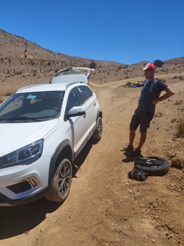 À force de tirer sur la corde, l’inévitable finit par arriver. Nous voilà bloqués au milieu de nulle part, avec une voiture hors d’usage. Heureusement, nous avons traversé le dernier village il y a seulement quelques kilomètres et partons donc à pied à la recherche d’aide pour nous sortir de ce pétrin, tout ceci sous un soleil brûlant. Notre espagnol, en constante progression, nous permet d’expliquer la situation et les habitants locaux se démènent afin de nous aider. C’est avec l’aide de deux d’entre eux que nous montons la roue de secours sur notre véhicule afin de le remettre en état de rouler, avec comme objectif de rejoindre La Serena pour y acheter un nouveau pneu. Cependant, les 80 kilomètres nous séparant de la ville doivent se faire sur une piste très peu fréquentée où aucun signal réseau n’est disponible… une nouvelle crevaison sur ce tronçon pourrait s’avérer plutôt embêtante ! Heureusement, un des villageois nous informe qu’il empruntera cette route plus tard dans la soirée, et donc qu’en cas de soucis, il pourra nous aider. C’est avec une grande prudence que nous rejoignons La Serena, et malgré le soulagement général lors de notre arrivée, nous réalisons vite que la réparation du pneu devra attendre quelque peu. En effet, il est samedi soir et les garages ne rouvrent pas avant lundi matin. Nous en profitons pour entreprendre de nouvelles sessions d’astrophoto dans les environs, en nous contentant cette fois-ci de rester sur des routes asphaltées.