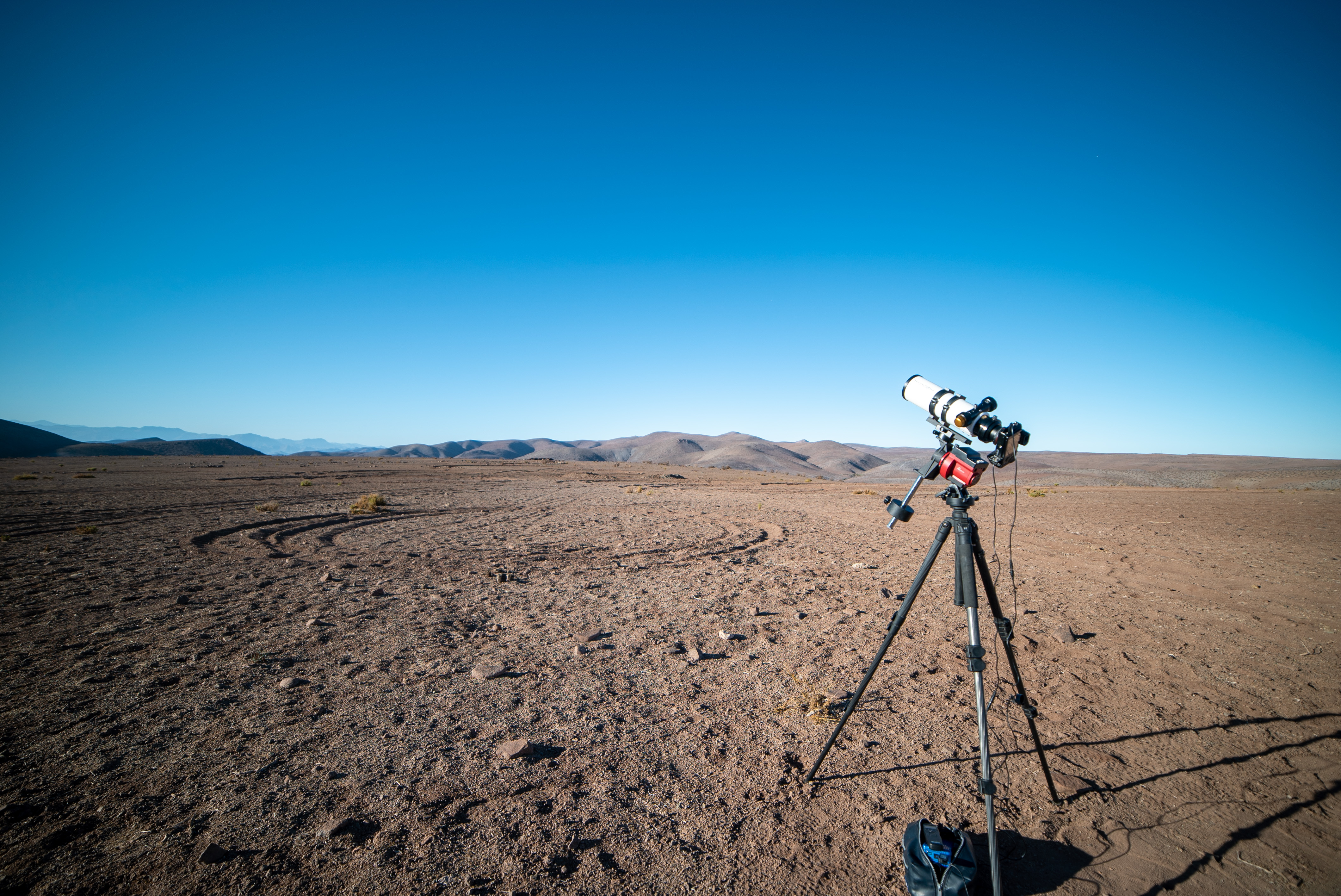 Finalement, notre petit télescope fait souvent pâle figure face à ces géants, mais une fois la nuit tombée, il révèle son plein potentiel et nous permet de découvrir quelques objets fascinants de notre ciel. C’est avec une grande curiosité que nous observons le panorama nocturne de l’hémisphère sud; nous voyons pour la première fois quelques merveilles non accessibles depuis la Suisse. Nous enchaînons alors quelques journées bien rythmées: réveil aux alentours de 9h dans une tente transformée en sauna par le soleil déjà très chaud, petit-déjeuner composé de porridge rendu plus gourmand grâce à l’ajout généreux de fruits, de sucre et de cannelle, puis découverte en voiture de la région et finalement recherche d’un lieu adéquat pour la nuit. La dernière étape quotidienne effectuée, nous montons les tentes et nous nous délectons d’un délicieux mets composé, sans grande surprise, de couscous, de pâtes ou de riz à la sauce tomate. Après le coucher de soleil vient l’heure de partir à la chasse aux nébuleuses avec notre dispositif astrophotographique.