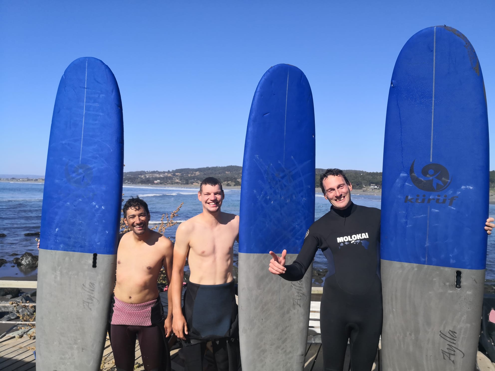 Lundi matin, nous parvenons à remplacer notre pneu à moindre coût et décidons de changer de décor et de nous mettre en route en direction de la côte pacifique et plus précisément de Pichilemu. Là-bas, nous y retrouvons Bertrand, un ami de nos copains sauratois, qui y vit avec sa compagne Pachy. Le programme est alléchant: session de surf et barbecue nous sont proposés. À peine débarqués dans cette sympathique ville côtière, nous partons à l’assaut des vagues dans une eau bien fraîche ! Nous enfilons nos combinaisons, et après une partie théorique expliquée en espagnol par notre instructeur du jour, nous nous jetons à l’eau. Au bout de trois tentatives, nous sommes déjà tous lessivés : La pratique du surf fait appel à des muscles qui, chez nous, n’existent plus depuis bien longtemps. En effet, trois mois de vélo ont fait migrer les troupes du haut du corps dans les cuisses et les mollets, si bien qu’il nous est difficile de faire preuve d’explosivité au moment de nous hisser sur nos planches. Finalement, nous passons une session tout en détente et en rigolade, chacun réussissant tour à tour à tenir plus ou moins debout sur son surf et offrant quelques belles gamelles pour le plus grand plaisir des camarades. Après tous ces efforts, c’est l’heure du traditionnel asado sud-américain composé de longaniza, costillar et lomo vetado, le tout grillé par Bertrand, le parillero du soir. Nous accompagnons ce bon repas par des boissons typiques chiliennes préparées par Pachy et découvrons alors les Terremotos et le Cola Del Mono.