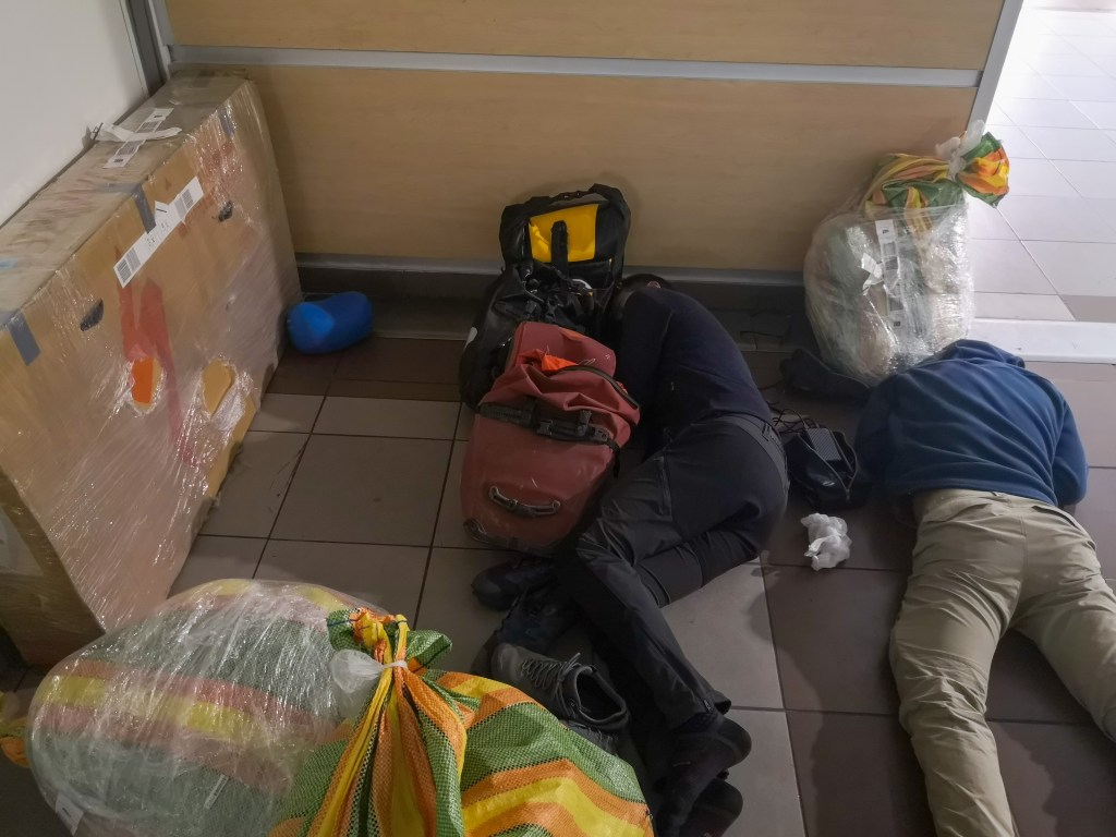 Une seconde secousse permet de répondre à cette interrogation: un tremblement de terre non loin de la capitale péruvienne aura réussi à raccourcir encore davantage la nuit des Riders, qui vivent là leur premier tremblement de terre sur sol sud-américain. Quelques instants plus tard, à 3h du matin, il est temps de se lever et d’embarquer pour l’aéroport. Une fois sur place, c’est la douche froide: au check-in de notre vol JetSmart, nos cartons à vélos sont trop lourds et nous devons nous acquitter d’une surtaxe pour cet excès de poids… l’histoire se répète et comme à Madrid, nous passons à la caisse avec un brin d’amertume. Décidément, vélo et avion ne font pas bon ménage. Arrivés à Santiago, nous entamons un parcours du combattant afin de passer le protocole Covid-19 destiné à tout nouvel arrivant sur sol chilien. Entre autres, un nouveau test PCR est effectué, et nous devons rester en isolement jusqu’à l’obtention d’un résultat négatif de ce dernier. N’étant pas séduits par l’idée de payer un hôtel afin d’y passer notre période d’isolement, nous décidons de rester à l’aéroport dans l’attente du résultat. Cela nous permet d’économiser au moins une nuit d’hôtel. C’est aux alentours de 21h30 que le résultat négatif nous parvient, et au vu de cette heure tardive, nous décidons de passer la nuit à l’aéroport et de se mettre en route le lendemain de bonne heure. Nous inspectons tous les recoins du hall des départs afin de trouver un endroit calme pour y gonfler nos matelas et y passer la nuit.