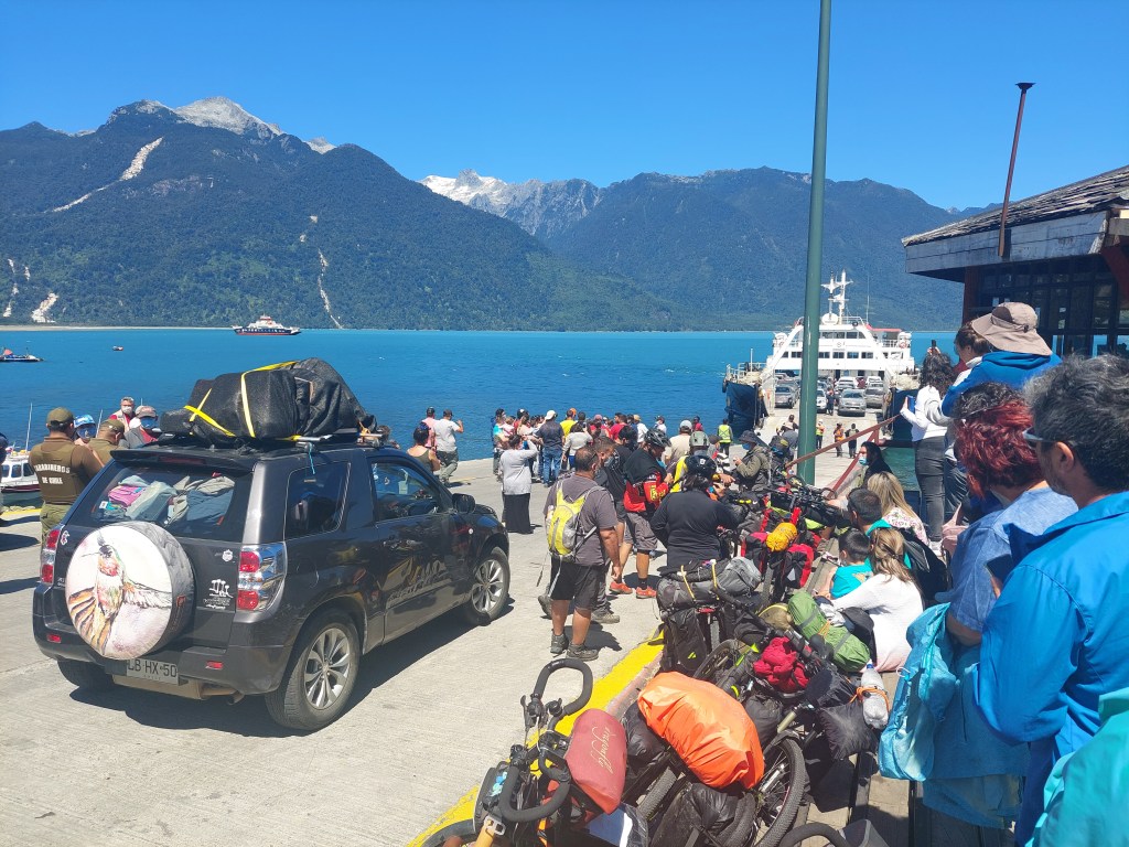 Notre répit est de courte durée puisque le premier goulet d’étranglement fait son apparition 50 km plus loin: la route s’arrête à Hornopiren, un petit village au bord d’un joli fjord. Une compagnie privée de ferrys se charge du transfert des véhicules, trois fois par jour, jusqu’au prochain port d’où repart la route. À notre arrivée à Hornopiren, l’embarcadère et ses environs sont surchargés de voitures : on nous explique que cette année, il y a deux fois plus de monde que d’habitude et que la plupart des automobilistes n’ont pas de ticket pour embarquer. C’est donc avec une appréhension particulière que nous nous rendons au guichet pour acheter 4 tickets cicloviajeros. La sanction tombe :