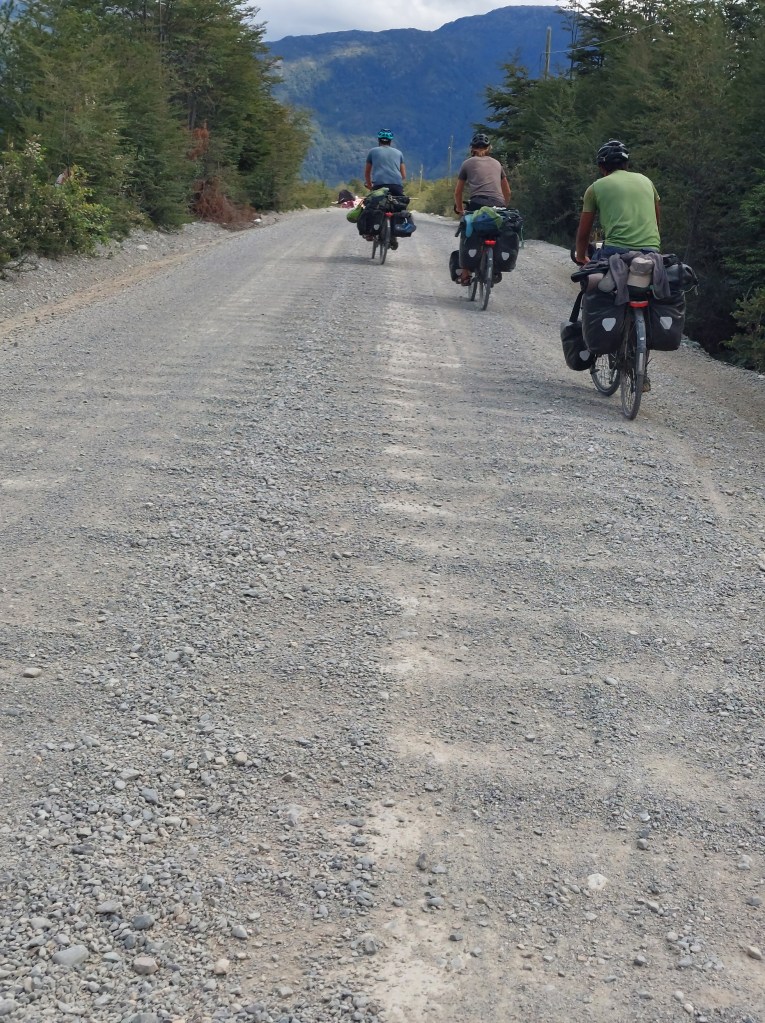 Même si le tracé officiel de route commence à Puerto Montt, ville d’une centaine de milliers d’habitants et porte d’entrée autoproclamée de la Patagonie, nous décidons de faire un petit détour par un bras de mer voisin pour éviter un traffic routier important aux abords de l’agglomération. C’est l’occasion de se (re)familiariser avec le ripio chilien. Le ripio n’est pas une spécialité culinaire locale, mais un revêtement de route bon marché proche d’un chemin de campagne suisse non-goudronné. Très vite, nous regrettons déjà l’asphalte: ça secoue, les roues dérapent dans les montées, on se cramponne au guidon et aux freins dans les descentes, la poussière soulevée par les voitures nous enfume, on n’entend plus la musique de la boom… Le pire de tout reste sans conteste la « tôle ondulée » sur laquelle on roule sur certains passages: des vaguelettes font leur apparition au milieu de la route pour un inconfort maximal garanti ! Cependant, l’absence de bitume procure une sensation d’aventure. On a parfois l’impression que la civilisation se termine avec la route goudronnée. Les villages sont beaucoup plus espacés les uns des autres et la nature bien plus sauvage. Même si en fin de journée les jambes sont plus lourdes qu’à l’accoutumée et que quelques douleurs apparaissent dans nos avant-bras, nous avons l’impression de mériter davantage chaque jolie vue et chaque fjord turquoise.