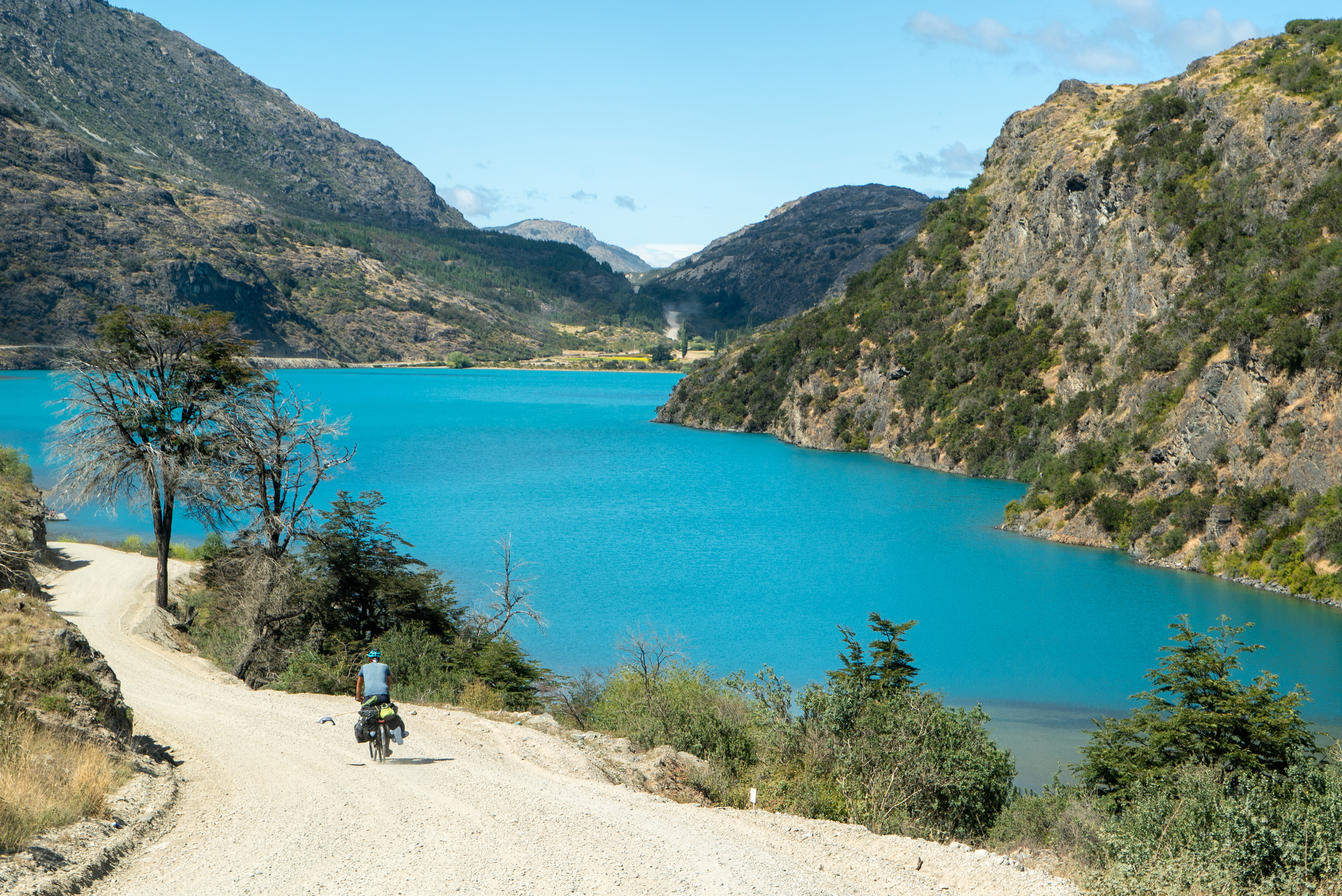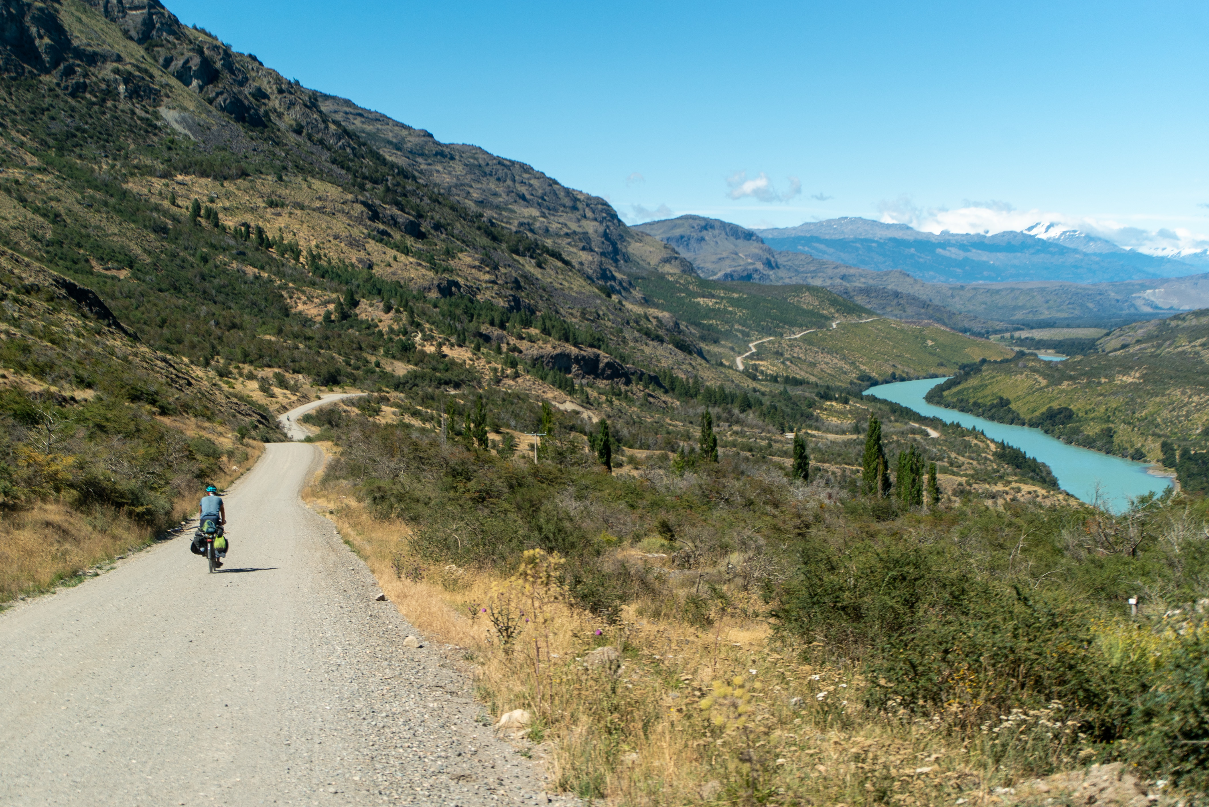 Quelques jours d’efforts plus tard, nous atteignons le lac General Carrera. Oubliés, les fonds de vallée qui ressemblent au Chablais ! La Patagonie profonde a tenu ses promesses. Montagnes pelées qui se jettent dans des eaux turquoises nous en mettent plein la vue. La route qui sinue jusqu’au village de Cochrane offre elle aussi des paysages inoubliables de rivières serpentant dans des gorges abruptes. Un des temps forts du voyage, assurément !