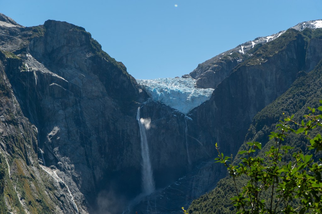 La suite de la route consiste en une longue vallée au charme tout relatif qui doit nous mener jusqu’au Parc national de Queulat – un incontournable de la Carretera Austral selon les locaux. Nous avalons les kilomètres à bon rythme, malgré le mauvais temps qui s’invite aux festivités. C’est dans la localité de La Junta que nous découvrons qu’à partir d’ici, le but du jeu est de traire les touristes. Les prix prennent l’ascenseur, l’amabilité des locaux aussi mais en sens inverse et la police de la commune n’hésite pas à dégager, à grands renforts de coup de pied dans le derrière, 4 Riders frigorifiés qui avaient prévu de passer la nuit dans un champ communal. Nous oublions assez vite ces désagréments quand nous atteignons Queulat; le glacier est effectivement impressionnant, même si la file indienne de touristes sur le chemin d’accès tempère notre enthousiasme.