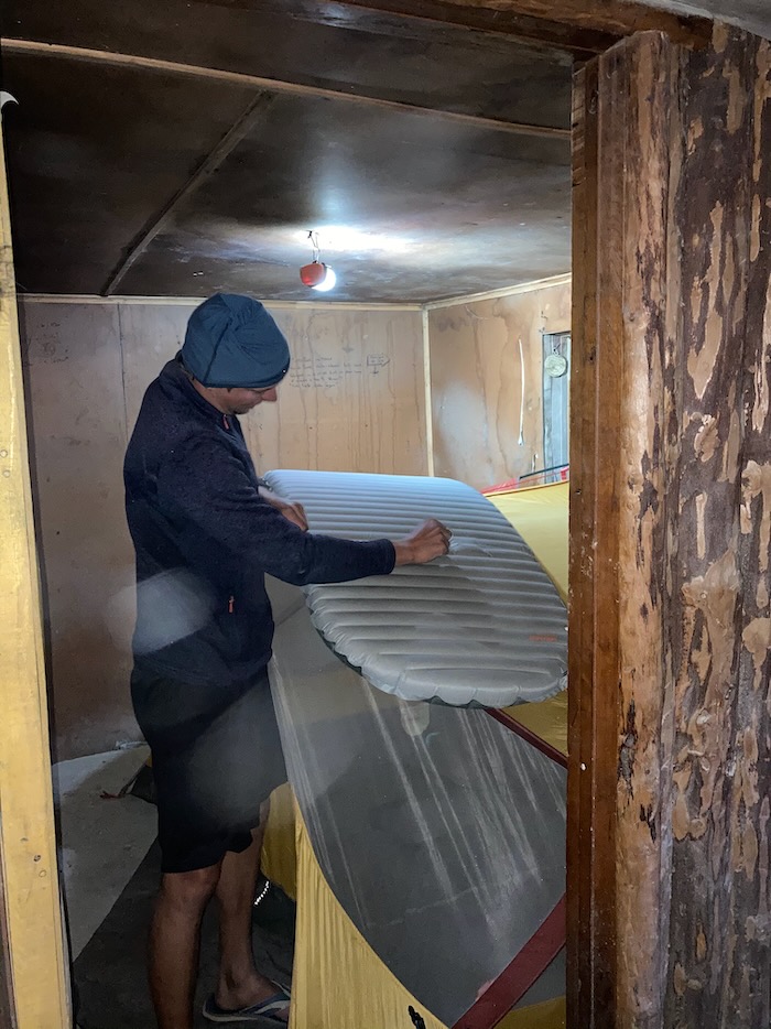 Juste avant d’arriver à Cochrane, Maxime expérimente un autre problème d’ordre pneumatique: son matelas Thermarest se dégonfle tout seul pendant la nuit. Les différentes tentatives pour colmater les brèches ne réussissent qu’à moitié. Chaque membre du groupe a son avis sur les causes de cet incident; « Thermarest, c’est de la camelote » dit Maxime, « T’es trop gros » disent les trois autres. Dans tous les cas, Maxime fera le nécessaire pour se dégoter un matelas de secours au plus vite…