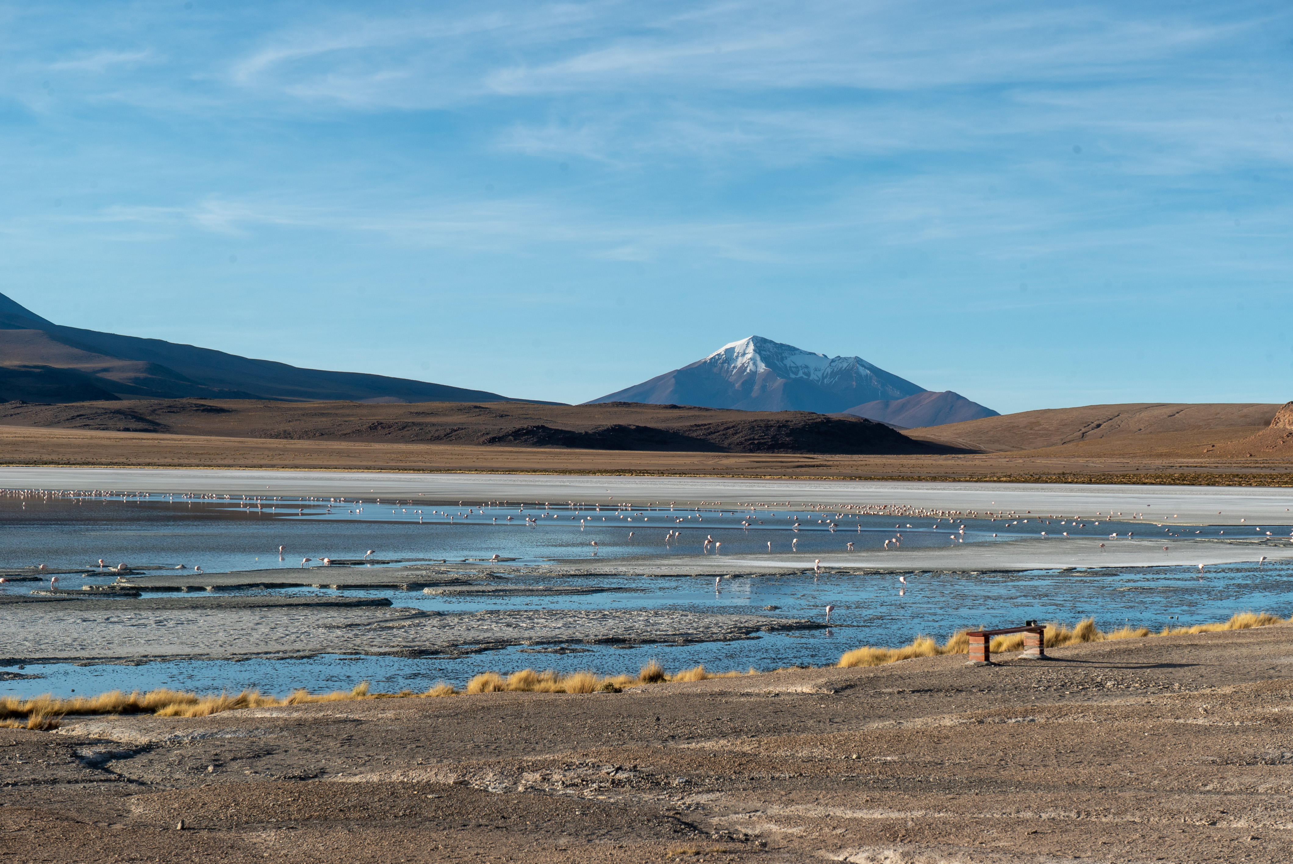 Puis, la qualité de la route s’améliore, le sable laisse place à un revêtement certes bien caillouteux mais mieux adapté à la pratique du vélo. Nous nous mettons en selle et profitons du spectacle magique qui défile sous nos yeux : Alors que la route plonge sur une première lagune, nous nous arrêtons pour prendre quelques photos. A peine le temps de reprendre la route qu’une deuxième lagune surgit de derrière un virage, puis une troisième qui sort de nulle part… Chaque lagune est différente, de par la couleur de son eau, la présence ou non de flamants roses et la forme des hauts sommets qui l’entourent.