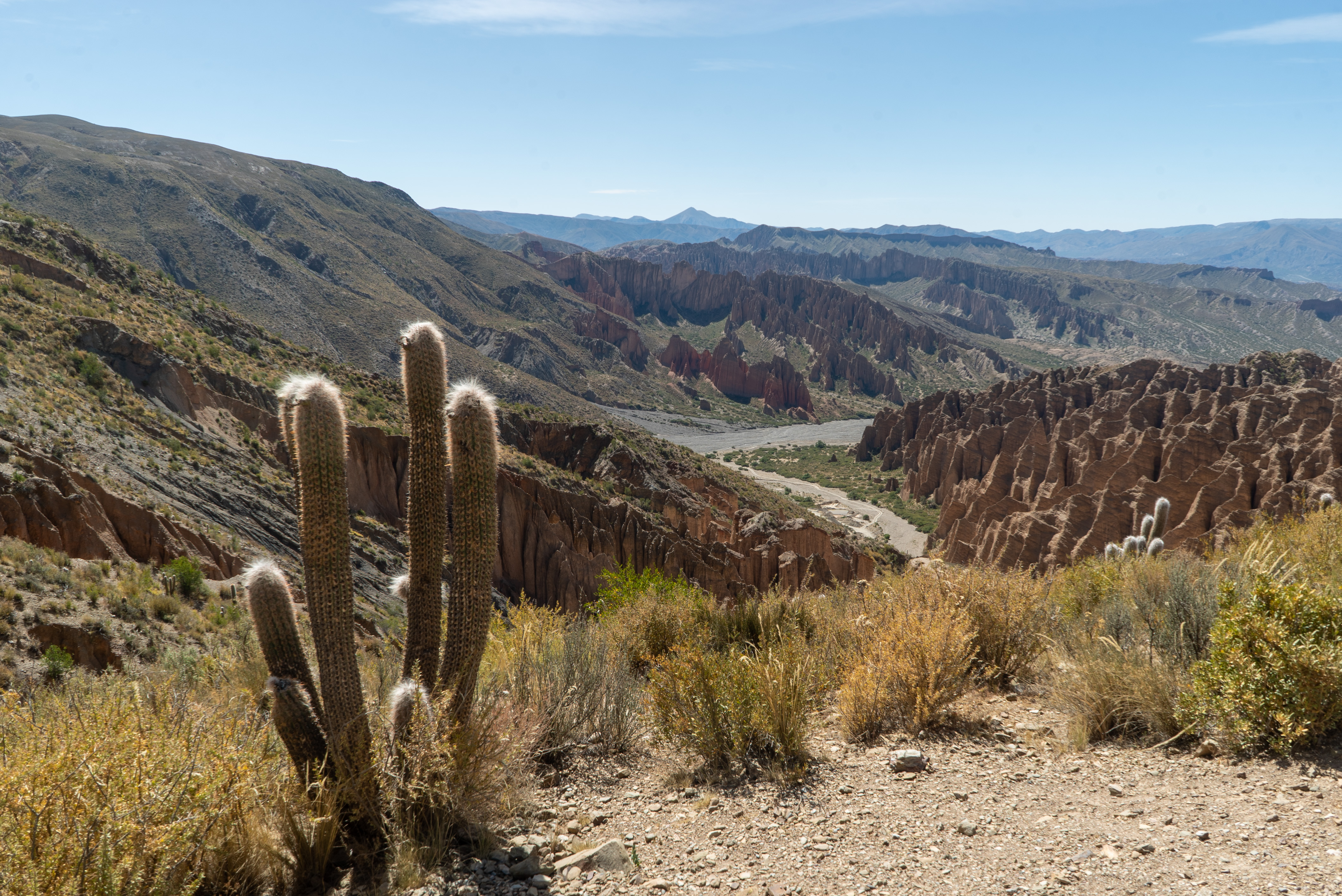 Le lendemain, nous partons de bonne heure à la découverte des routes boliviennes avec comme objectif de rejoindre Tupiza, porte d’entrée de la fameuse route des Lagunes. Si les paysages ne sont pas (encore) à couper le souffle, nous constatons avec joie la bonne conduite des Boliviens que nous rencontrons sur notre route. Ceux-ci sont très respectueux et patients au moment de nous dépasser et nous nous sentons alors en sécurité sur nos vélos. Arrivés à Tupiza, nous rejoignons Caren, qui sera notre hôte et guide lors de notre séjour. Avec elle, nous visitons les différents marchés de la ville et profitons de ses bons conseils pour déguster toutes sortes de plats traditionnels boliviens. Avec une locale comme Caren, aucune chance de se faire arnaquer et nous accédons aux lieux typiques où seuls très peu de touristes se rendent, quelle chance !