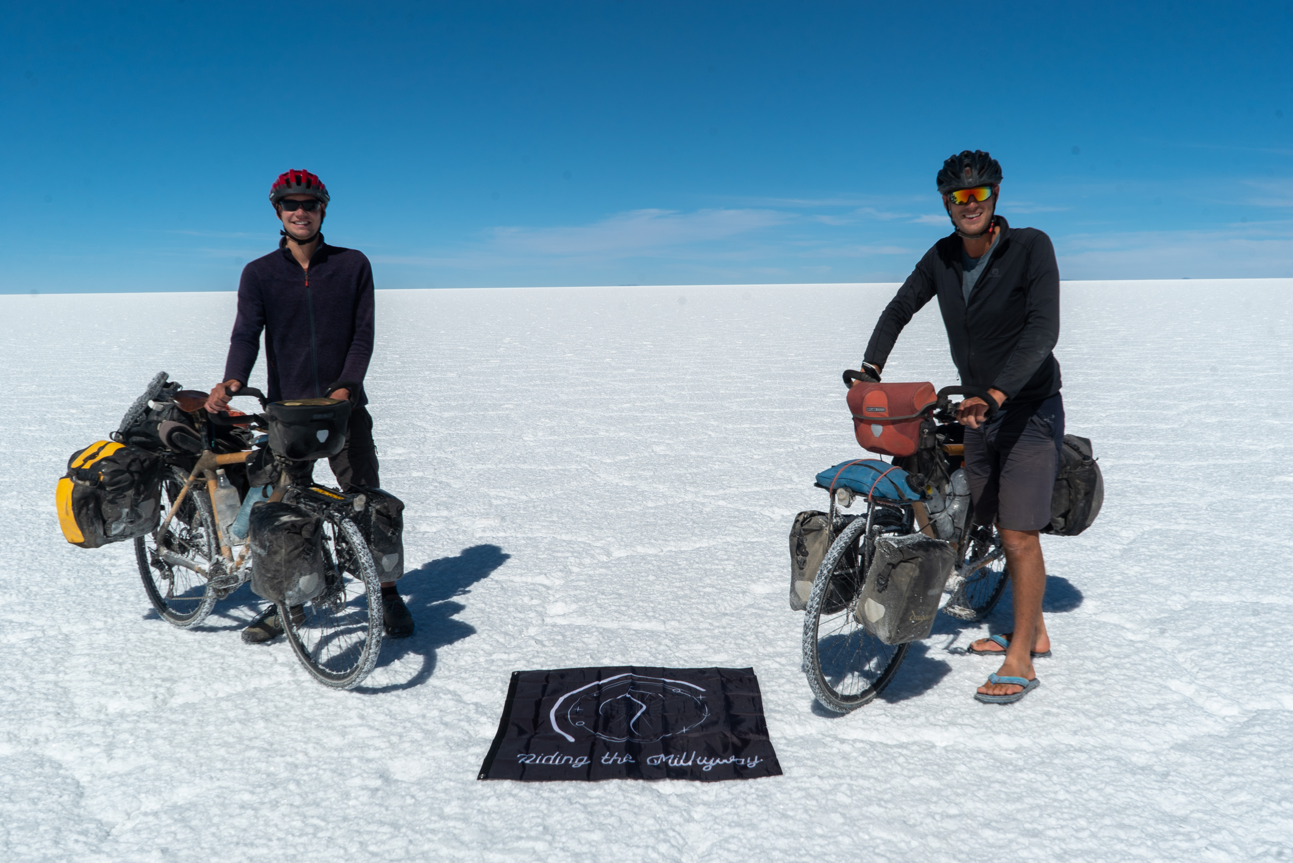 Nous avançons tranquillement en contemplant avec émerveillement ce spectacle hors du commun, avec comme seul bruit de fond les éclaboussures d’eau mises en mouvement par le passage de nos roues partiellement immergées. Aucune présence humaine, animale ou végétale à l’horizon, nous avons l’impression d’être seuls au monde. Nous poursuivons notre avancée dans ce décor venu d’ailleurs et après bientôt une heure, l’excitation diminue peu à peu et les premiers effets indésirables se font ressentir. En particulier, c’est au niveau des membres inférieurs que l’inconfort est le plus grand. Nous avons en effet opté de rouler en sandales afin d’éviter d’avoir nos chaussures gorgées d’eau salée après notre traversée de la partie immergée du Salar. Mais au vu de la fraîcheur de l’air à cette altitude, la température de l’eau ne doit pas dépasser les quelques degrés. Au contact avec nos pieds, la sensation de froid se fait vite ressentir et les orteils de Maxime ne tardent pas à geler, devenant presque aussi blancs que le sol du Salar ! Pour ne rien arranger à cette situation peu agréable, il est tout bonnement impossible de faire la moindre pause « au sec » afin de laisser le soleil réchauffer ses membres : Imaginez-vous en train de pédaler dans une étendue d’eau à perte de vue, et réfléchissez à un moyen de faire une pause sans mettre pied à terre (ou a eau, en l’occurrence) … c’est tout simplement impossible ! Dans de telles circonstance, l’unique option est de continuer d’avancer en maintenant le bon cap, en espérant regagner la zone sèche du Salar au plus vite. Mais au beau milieu de ce lac salé, impossible d’en distinguer sa sortie en raison des effets de réflexion du soleil sur l’eau ! Il faut donc serrer les dents et espérer que la terre ferme veuille bien apparaître rapidement. Après plus d’une heure et demie, la fin de la zone immergée se fait voir au loin, et pour le plus grand bonheur de nos orteils, nous pouvons de nouveau pédaler au sec.