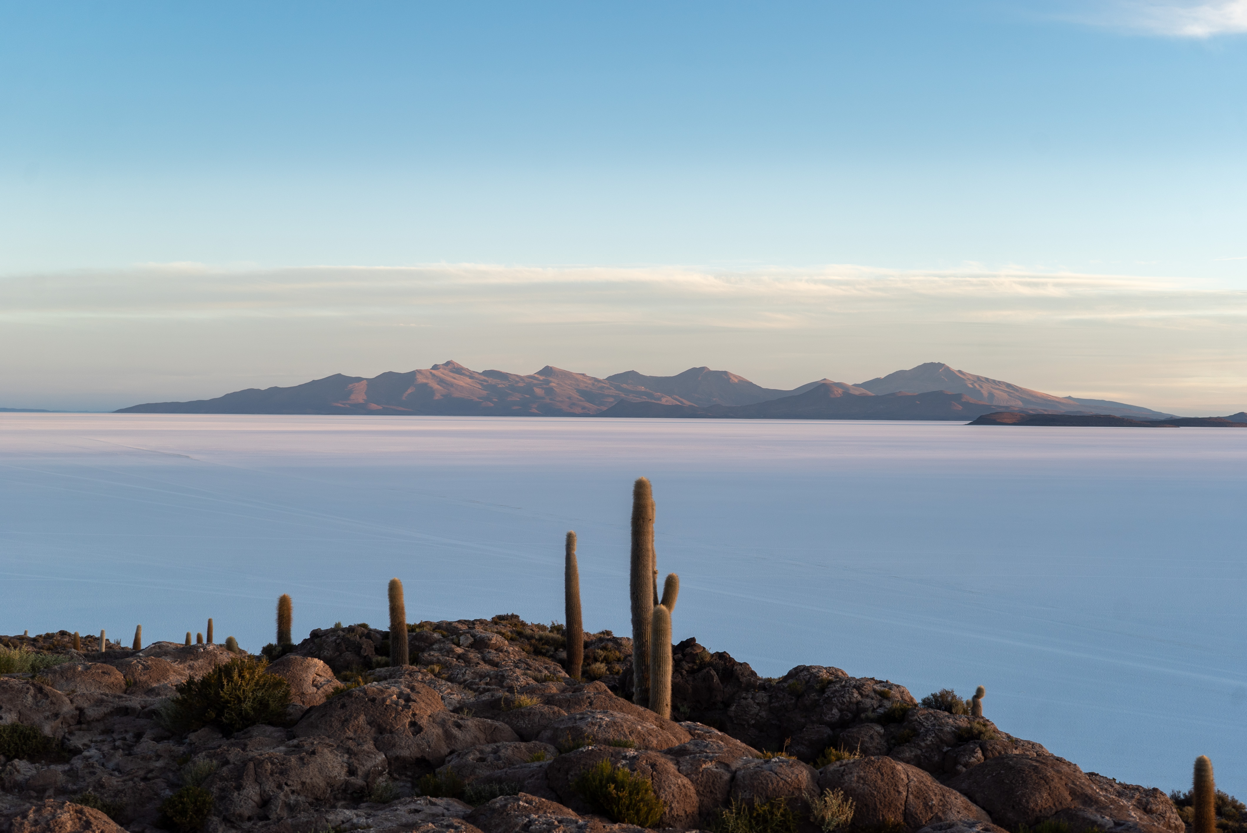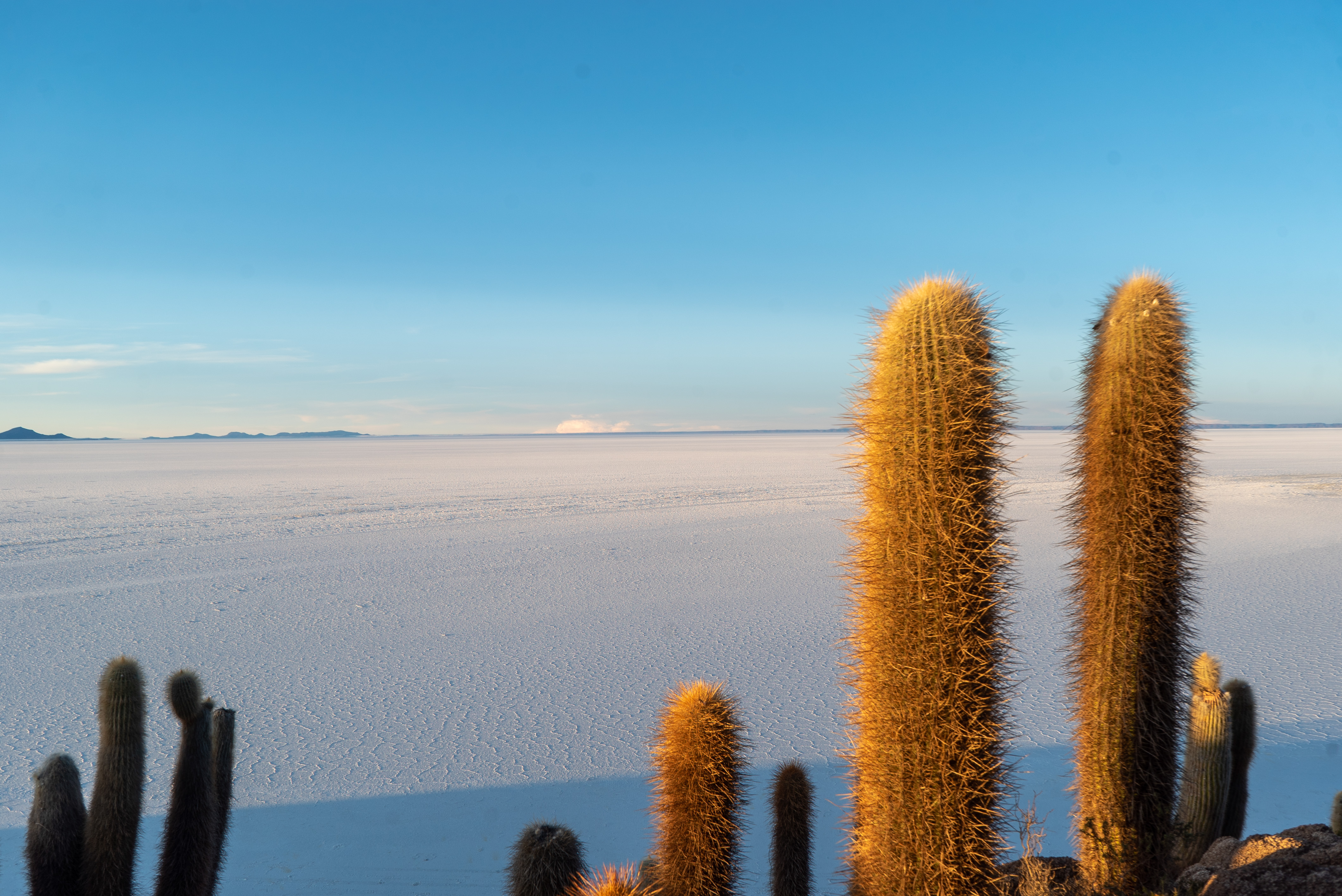 Puis, nous rejoignons l’île centrale et sympathisons avec l’un de ses gardiens, qui nous offre un abri pour la nuit. Dans de telles conditions, un toit et quatre murs offrent quelques degrés de plus pendant la nuit, et surtout une protection au vent non négligeable, augmentant drastiquement notre confort global ! Une fois installés, nous partons à l’assaut des petits chemins pédestres parcourant les divers recoins de cette île, peuplée par ses fameux cactus géants. Le spectacle est magnifique, le Salar s’étend à perte de vue dans n’importe quelle direction, et l’on peut alors prendre pleine mesure de l’immensité de l’endroit. À l’approche du coucher de soleil, nous nous postons au point culminant de l’île afin de profiter du fabuleux spectacle de couleurs une dernière fois, avant de quitter le Salar le lendemain.