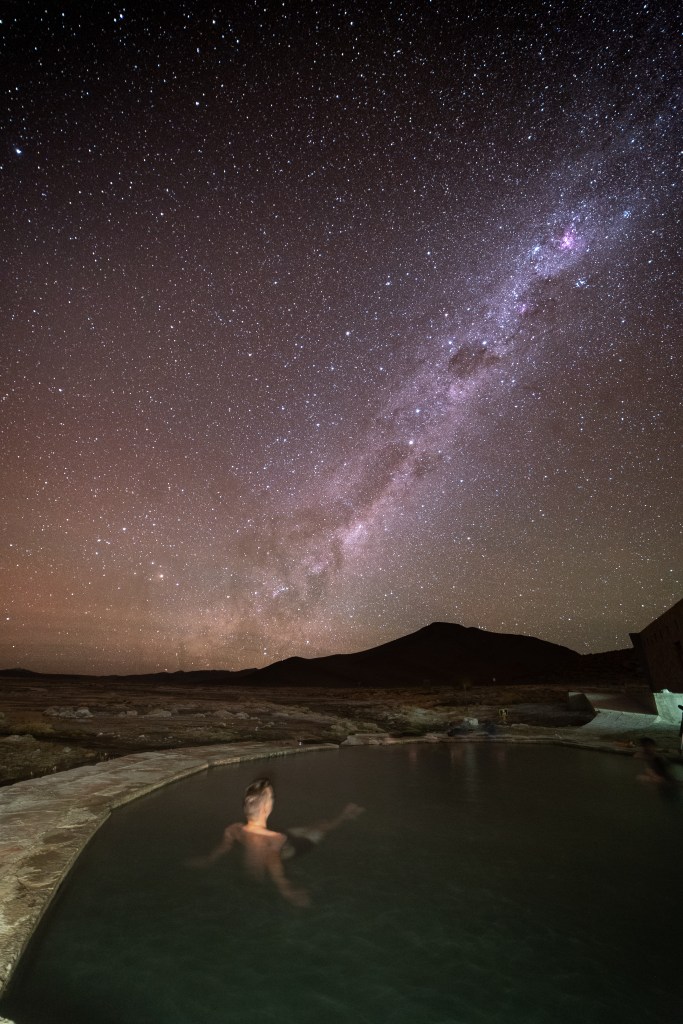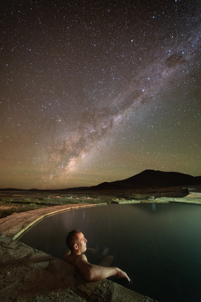 Lors du repas du soir, on nous annonce qu’un véhicule de remplacement sera acheminé dans la nuit afin de pouvoir poursuivre notre expédition dès le lendemain. C’est donc plus sereinement que nous abordons cette deuxième journée, où les lagunes aux différents tailles et couleurs défilent sous nos yeux, accompagnées par la présence de flamants roses et vigognes typiques de ces régions altiplaniques. Les paysages sont vraiment magnifiques, les heures et les kilomètres défilent vite et nous arrivons en fin de journée pour le clou du spectacle : le coucher de soleil sur la Lagune Verde, au pied du Licancabur ! Les couleurs sont superbes et il y règne une ambiance particulièrement spéciale, entre la lumière du crépuscule et les imposants volcans environnants. C’est à cet instant que notre guide s’aventure à quelques explications sur le fameux cratère du Licancabur, et de fil en aiguille il se retrouve à nous raconter d’un ton très sérieux la découverte de la Vie sur Mars… Bon, pour le coup, même si cela fait plusieurs jours que l’on est coupé du monde extérieur, il nous est difficile d’avaler une telle information ! Cette magnifique journée se conclut par un bain nocturne dans les Thermes de Polques à contempler la Voie Lactée dans une eau à près de 40°C, alors que la température extérieure chute drastiquement jusqu’à atteindre les -10°C au petit matin !