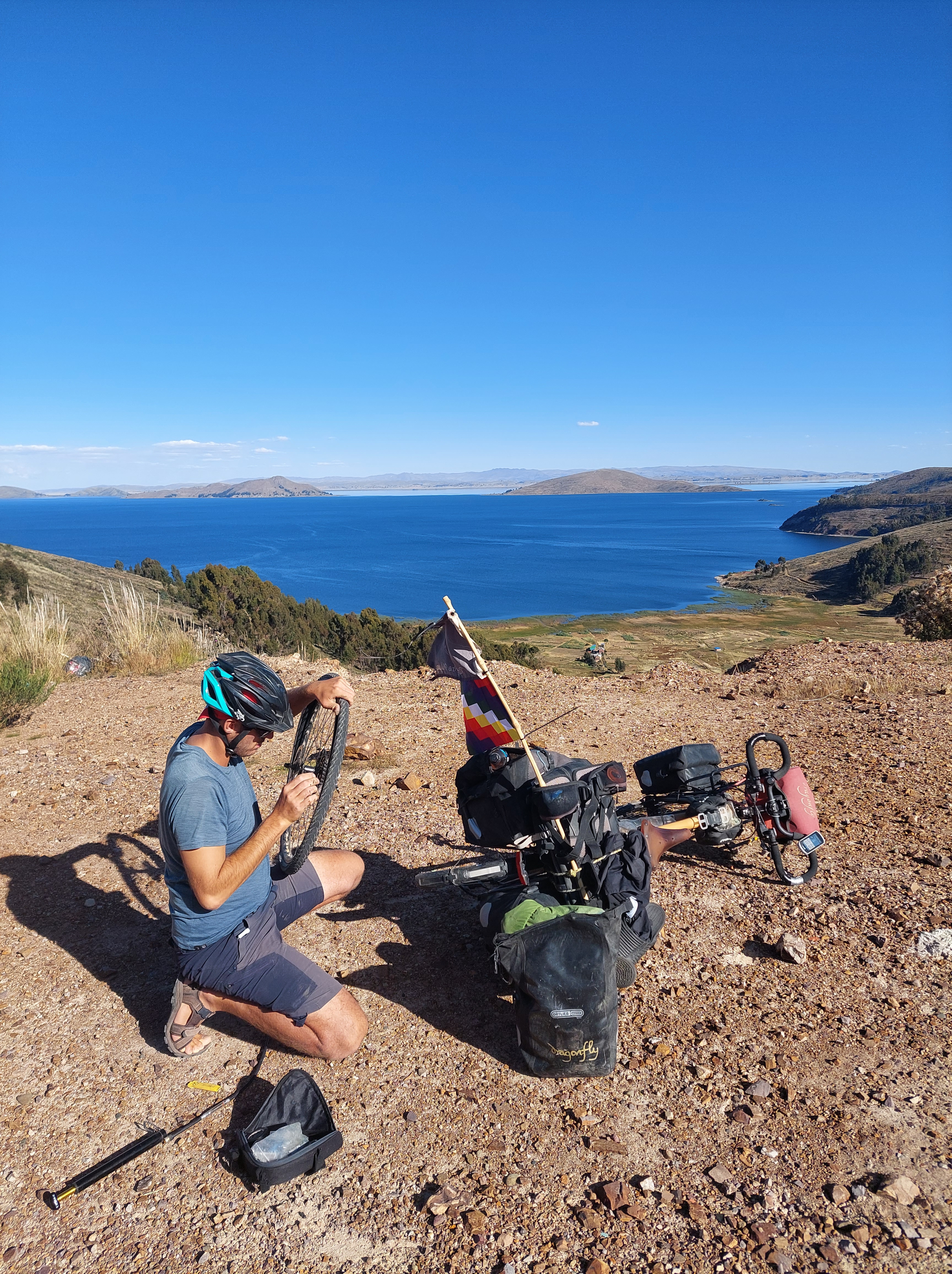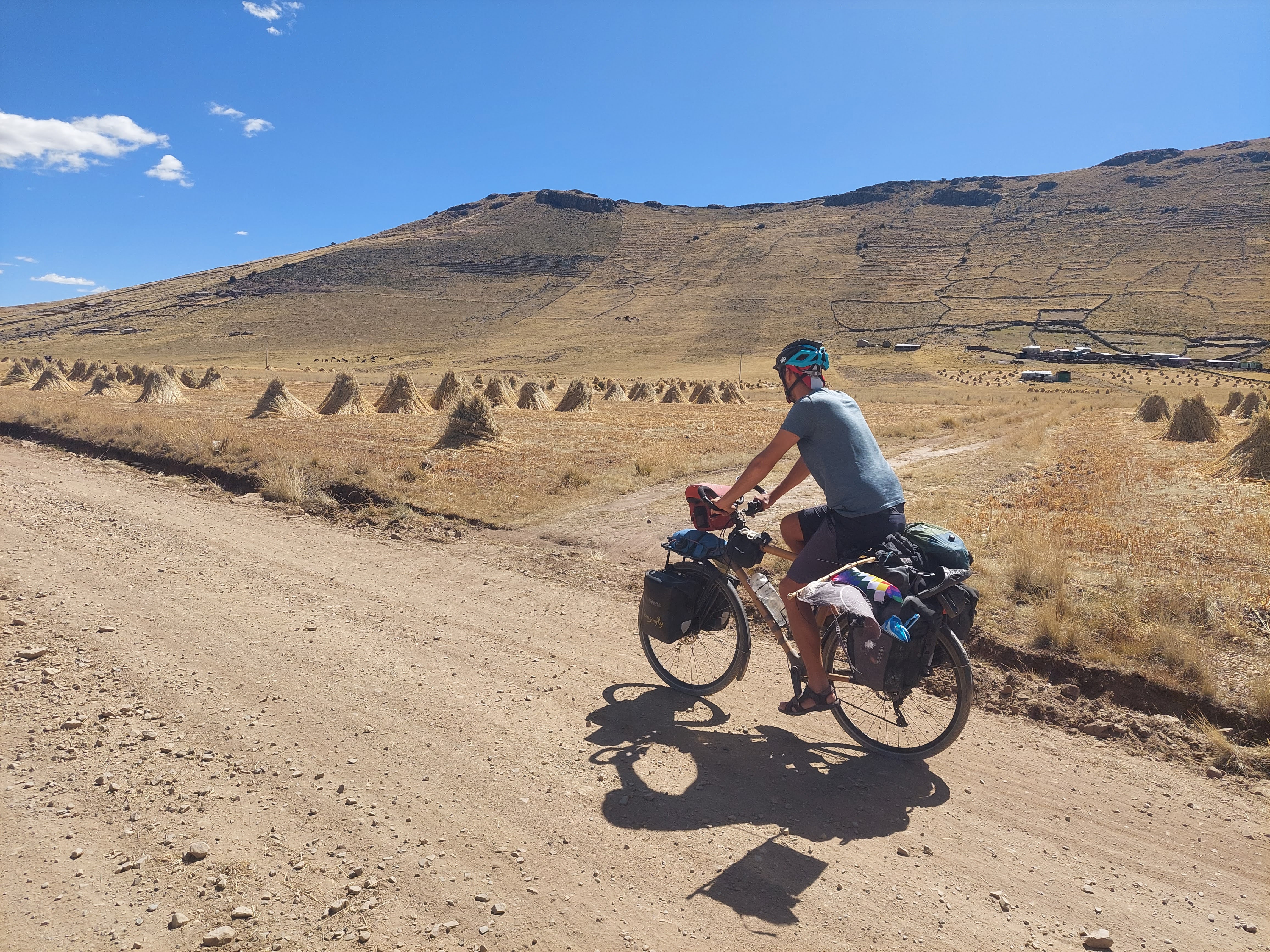 Même si l’entrée au Pérou s’est effectuée sans accrocs, les Riders savent très bien que la suite du programme ne s’apparente en rien à une promenade de santé. Tout d’abord, comme par magie, les premiers tours de pédale sur sol péruvien coïncident également avec le retour du combat avec les chiens ! La différence de comportement de ces animaux entre la Bolivie et le Pérou demeure pour nous un mystère, toujours est-il qu’à peine sortis de Bolivie, nous sommes de nouveau victimes des chasses à l’homme menées par des hordes de canins déchaînés. Deuxièmement, les longues lignes droites qui bordent le côté péruvien du lac nous laissent sans défense face au désormais constant vent du nord qui se lève quotidiennement dès onze heures du matin. Mais hormis les chiens et le vent, notre avancée est plutôt facile. Nous longeons le bord du Lac Titicaca sur des routes asphaltées et relativement plates, où nous rencontrons fréquemment des villages le long de notre route afin de se sustenter et se loger.