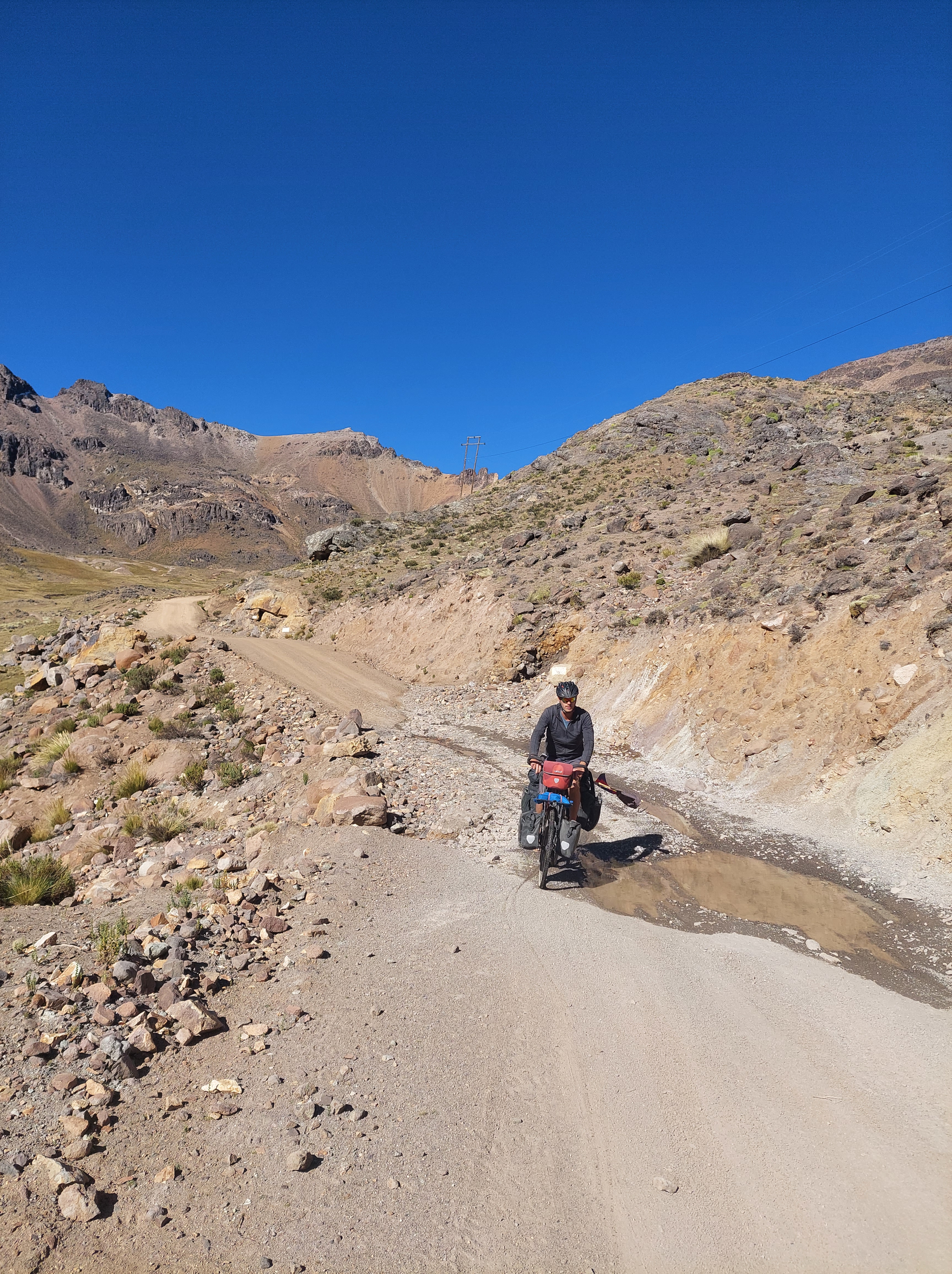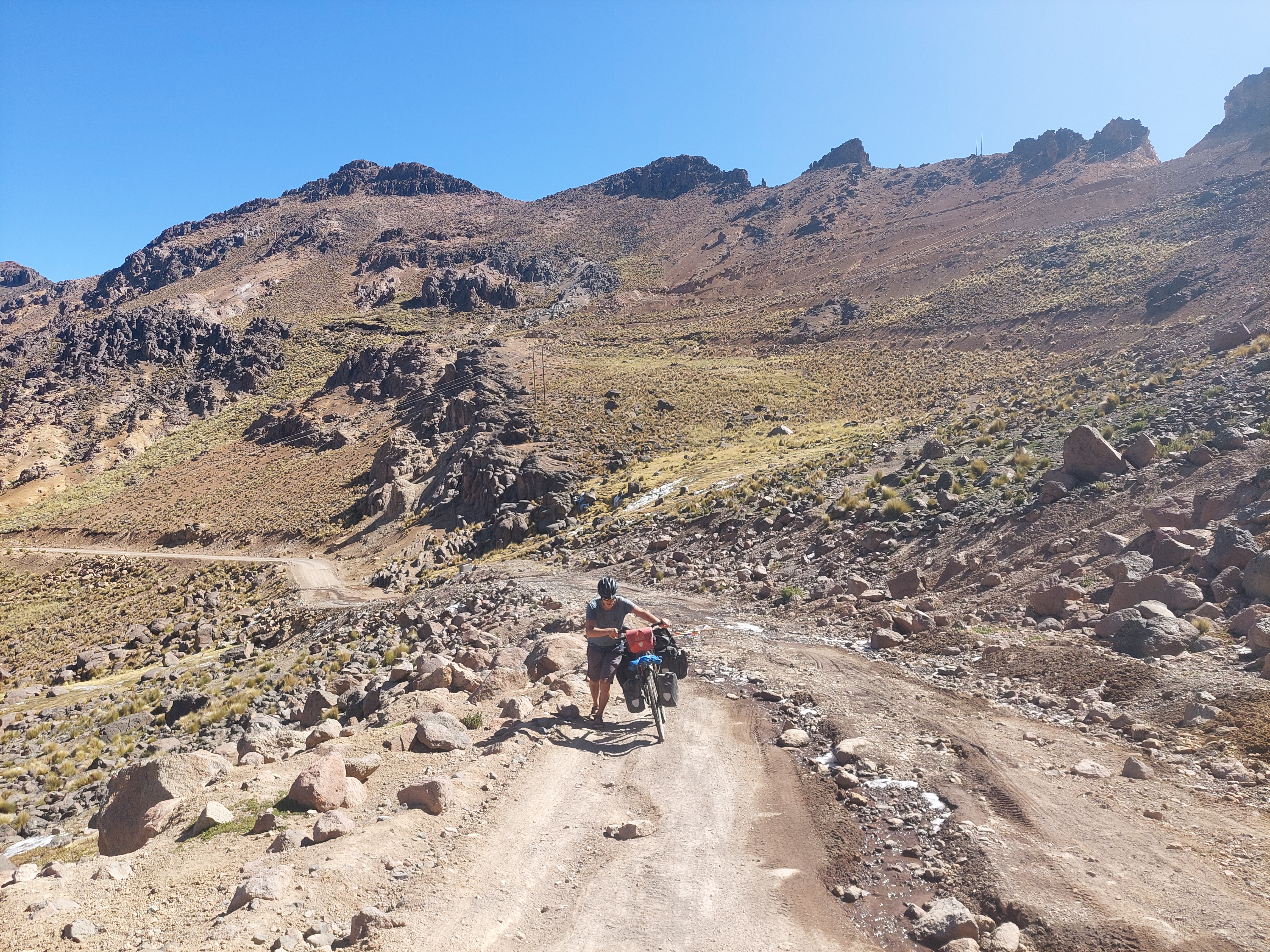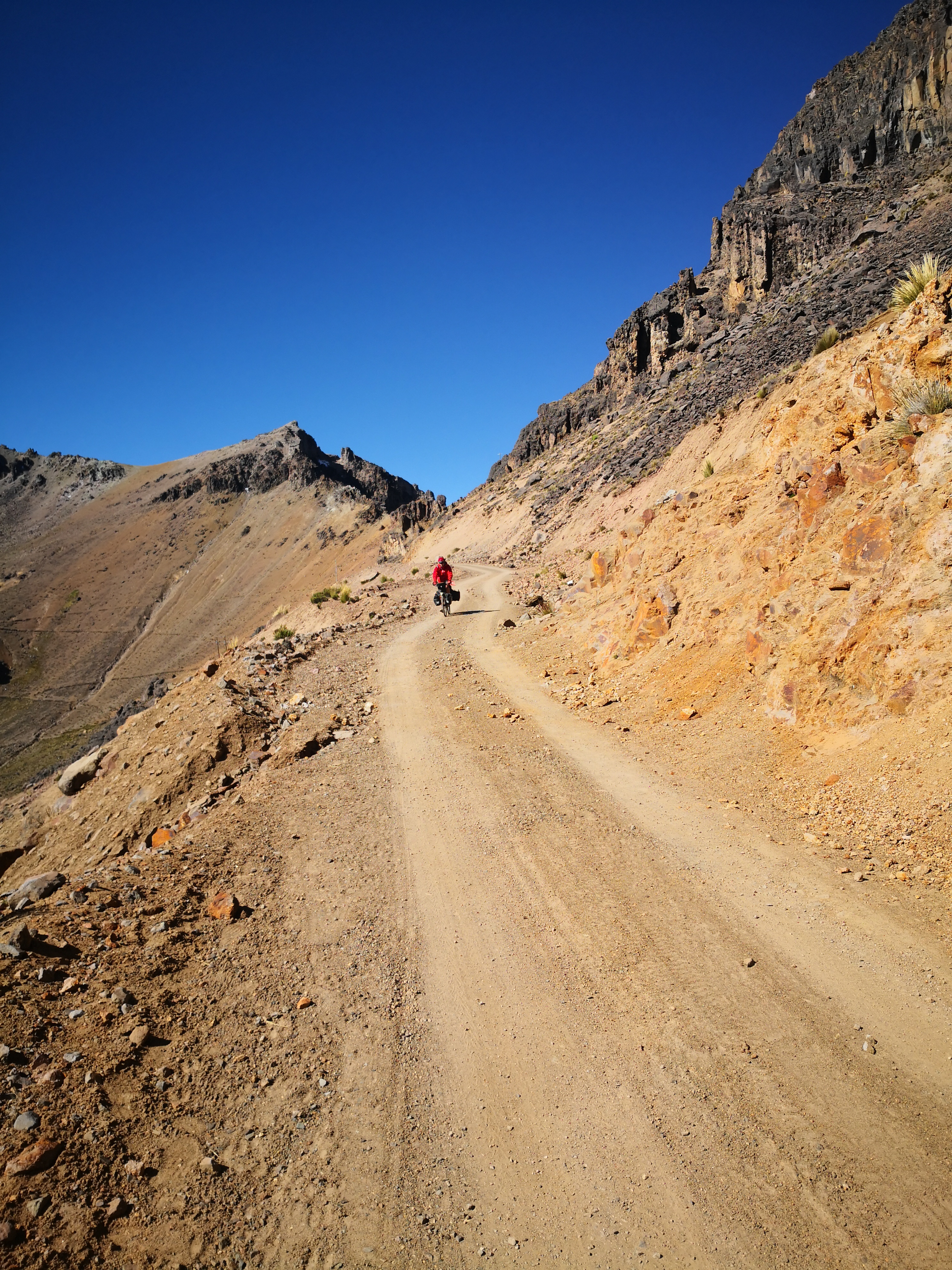 On s’élance alors à l’assaut de cette imposante paroi, et rapidement nous devons mettre pied à terre car la pente est trop raide. Nous poussons nos lourds vélos sur ce chemin en piteux état, nos pieds patinent sur ce revêtement sablonneux. Par endroits, des ruisseaux se trouvent sur la route, où l’eau est encore partiellement gelée en raison des températures nocturnes glaciales. Assurément cette montée a un côté épique. Pour ne rien arranger, le manque d’oxygène se fait ressentir, nous obligeant à faire des pauses tous les vingt mètres.