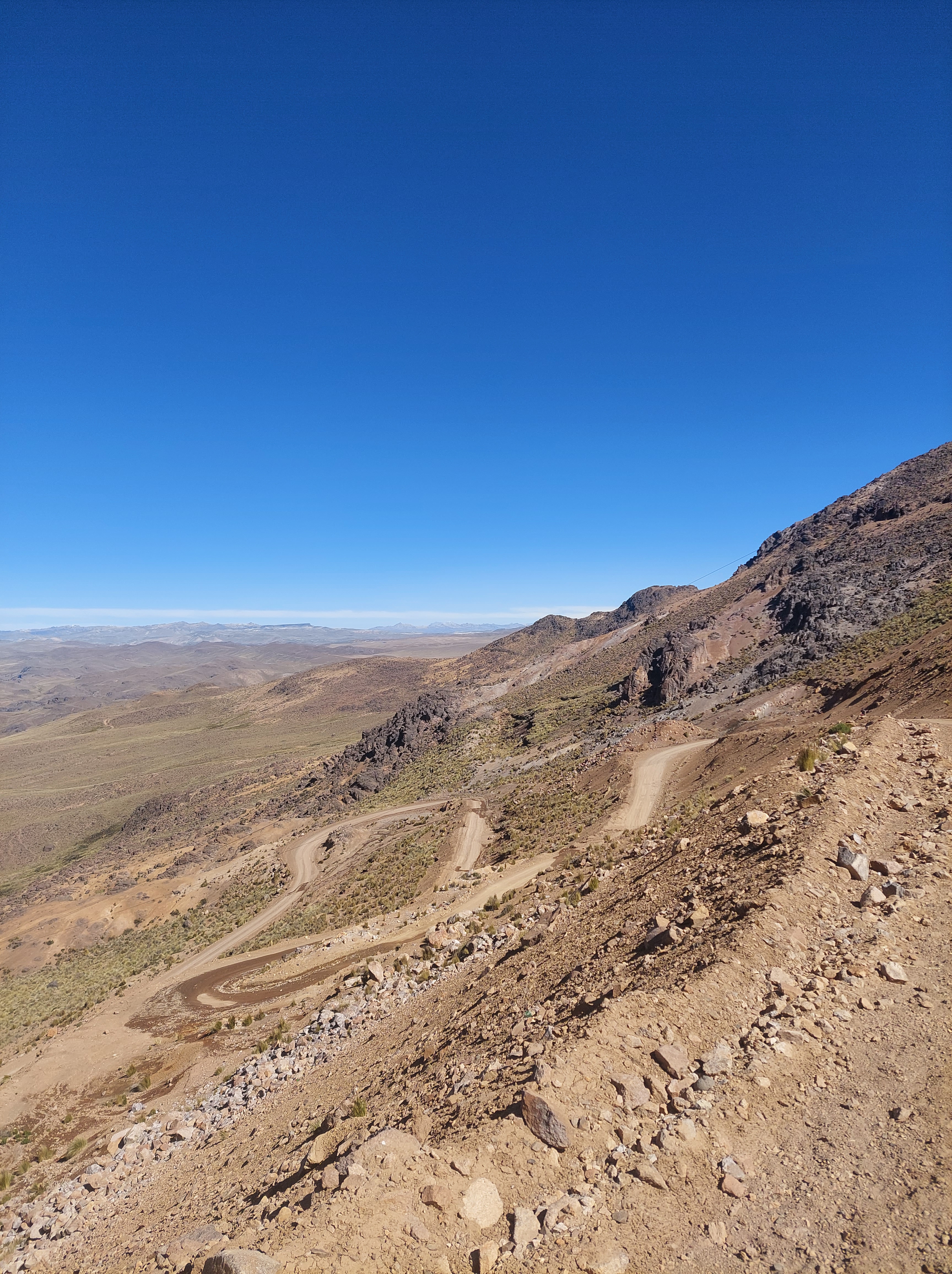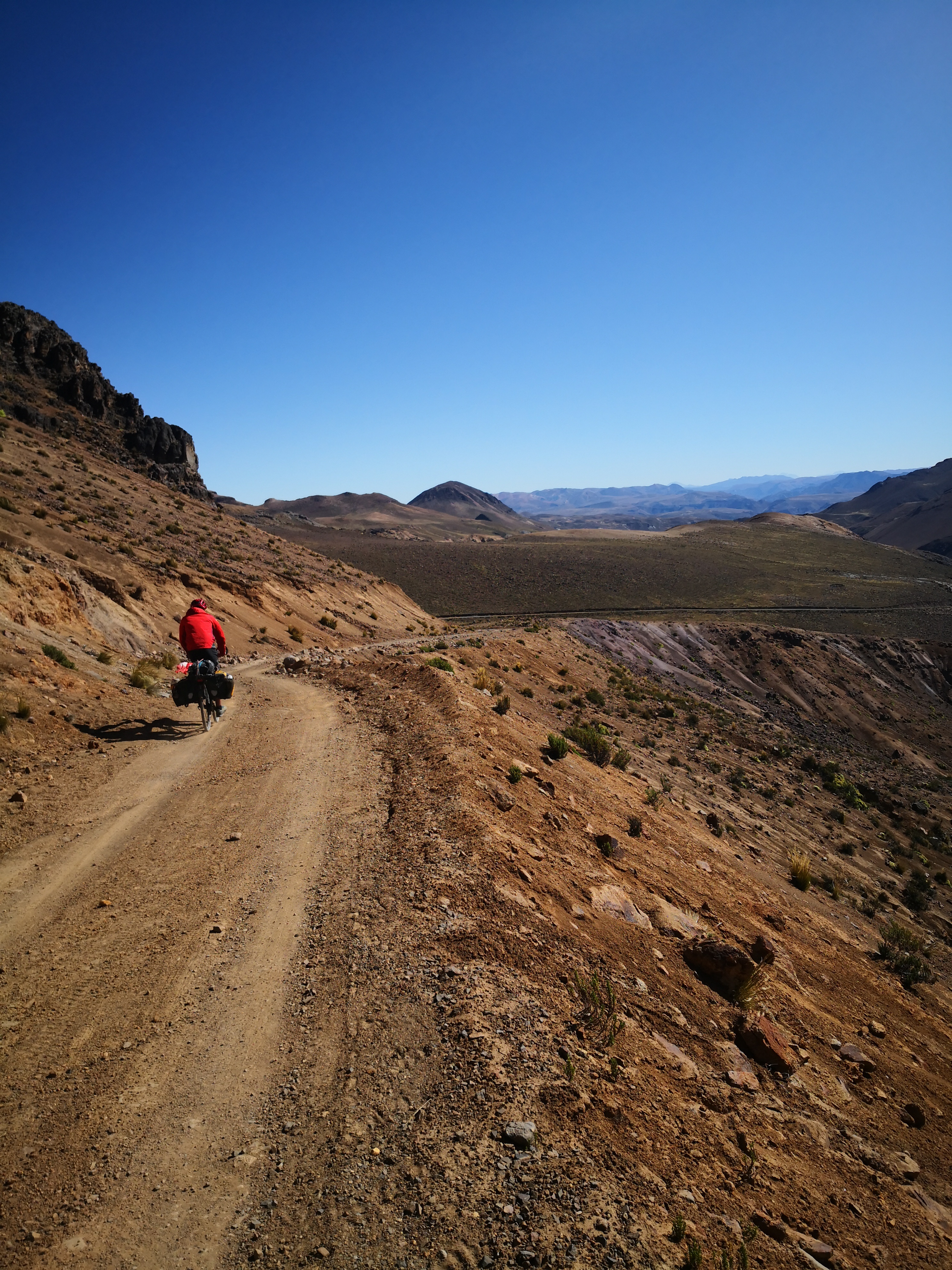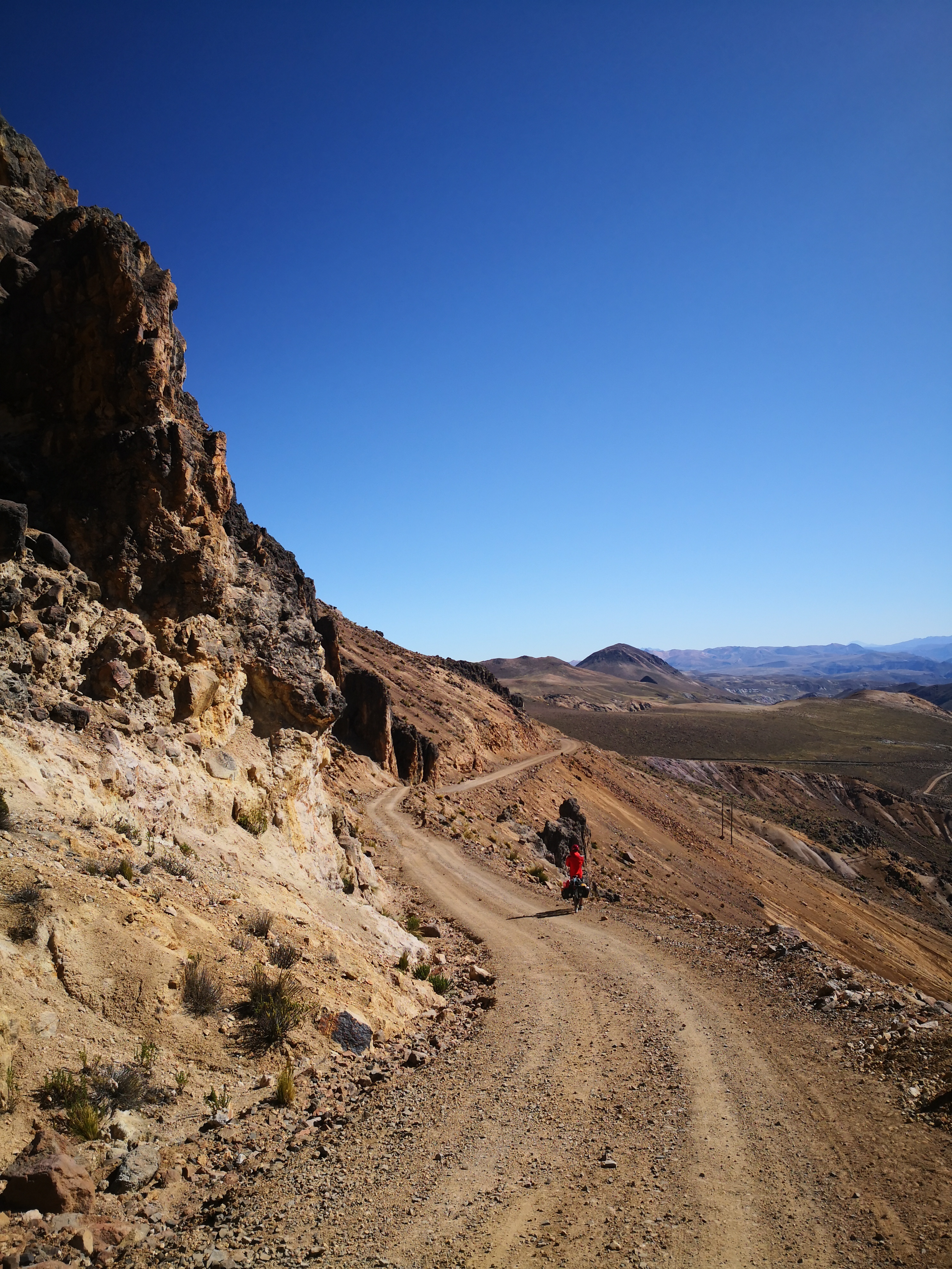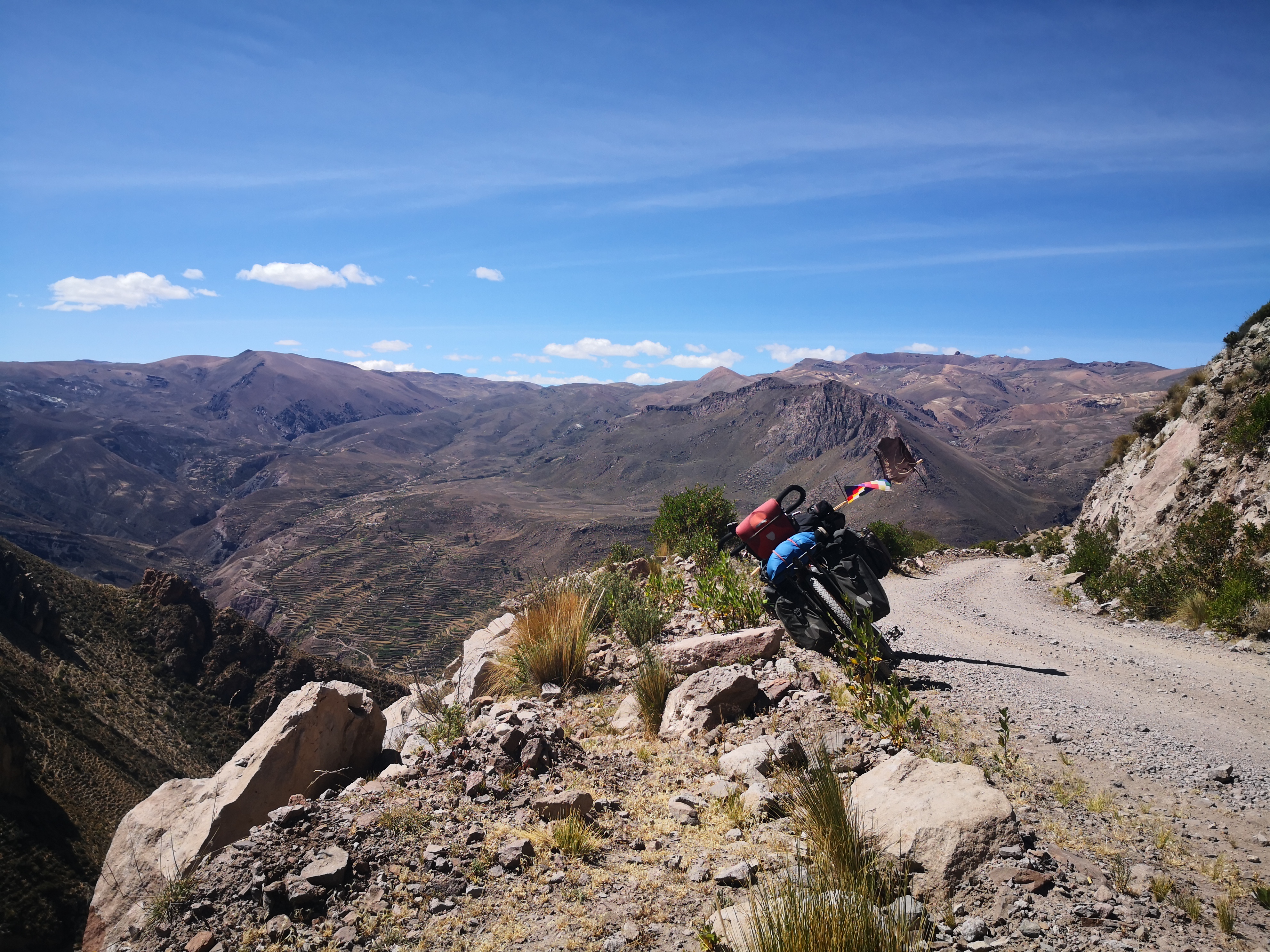 Nous poursuivons notre route dans une atmosphère qui se réchauffe petit à petit grâce aux rayons du soleil et bientôt il ne nous reste plus que de la descente afin de rejoindre Arequipa et sa météo clémente. Dans cette optique, nous attaquons les lacets caillouteux à vive allure mais sommes très vites ralentis par une première crevaison. Aussitôt réparée qu’intervient la seconde, puis la troisième… Notre patience atteint ses limites, nous analysons en détail le pneu, le fond de jante, la jante et les chambres à air, mais rien d’anormal n’apparaît à nos yeux. C’est dans cette incompréhension que nous poursuivons notre descente, cette fois-ci à un rythme plutôt lent afin de ménager nos chambres à air. Puis vient enfin l’asphalte, où nous pensons être tirés d’affaire.