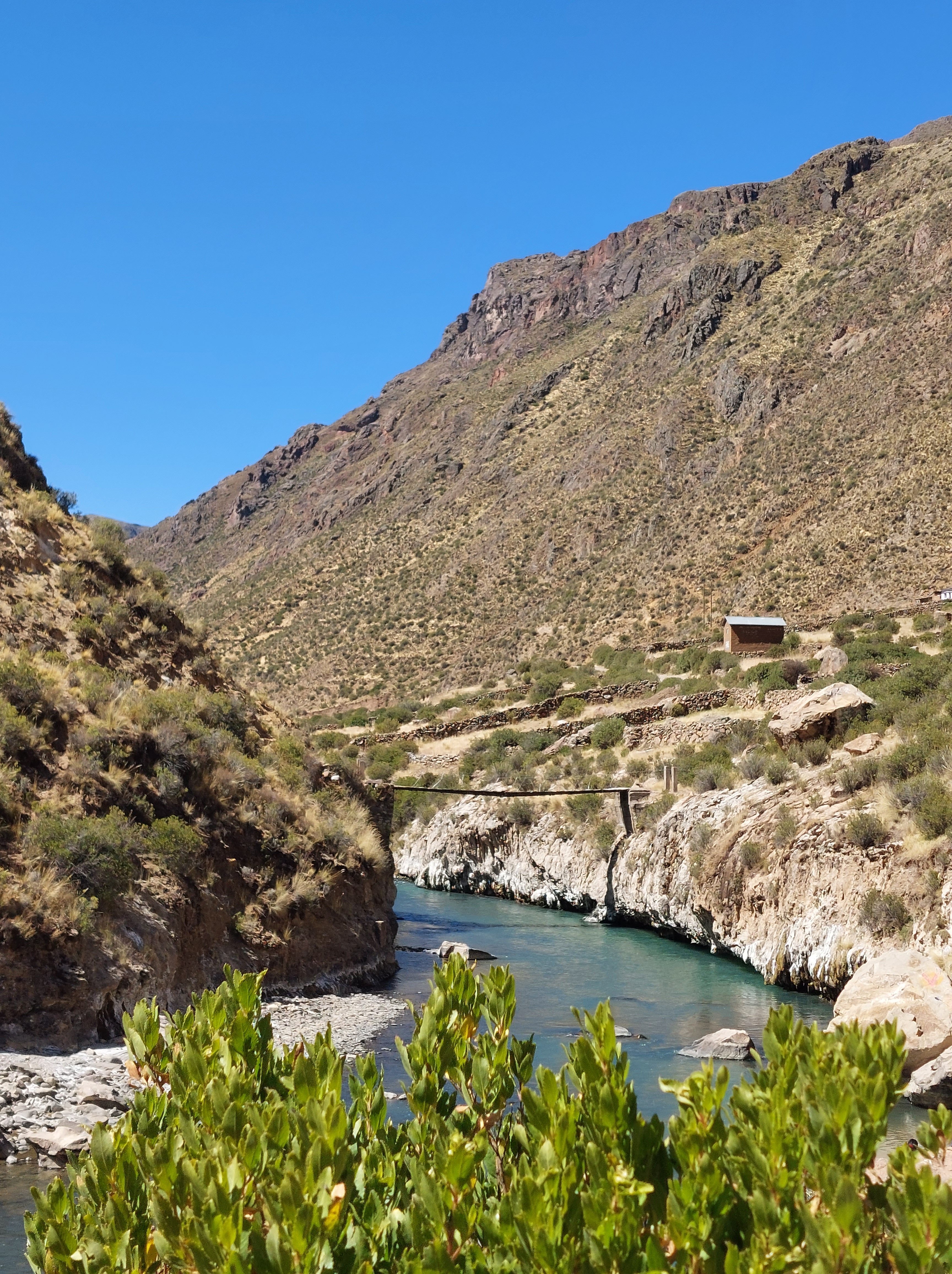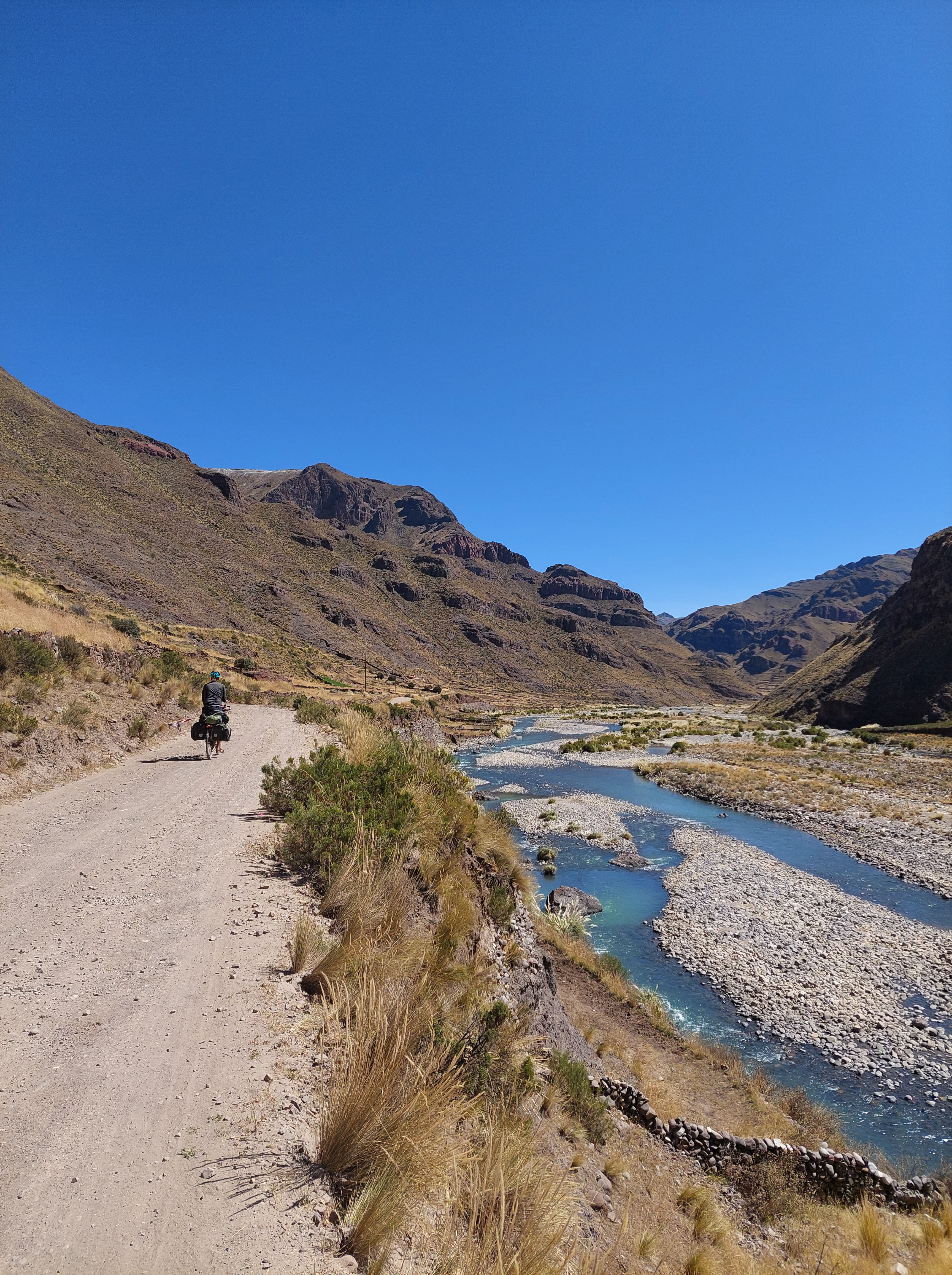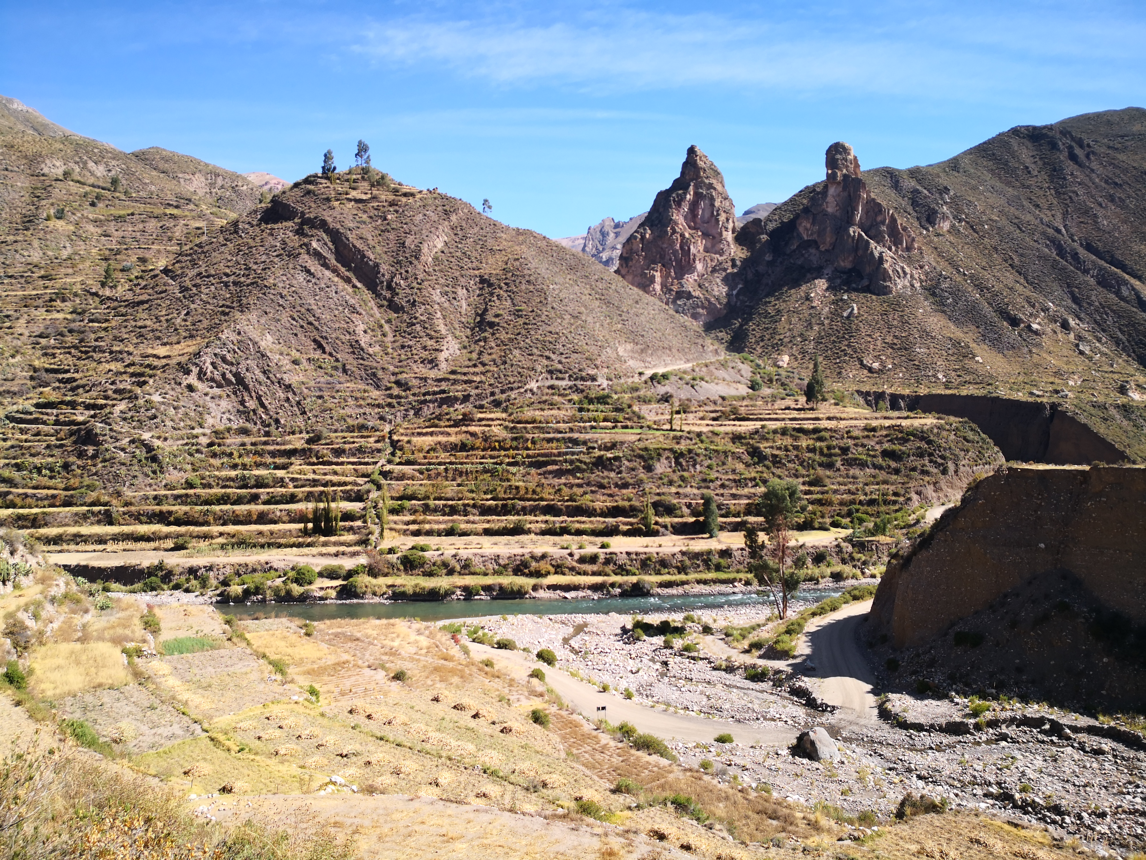 La descente se fait sur un chemin caillouteux de bonne facture, et nous nous retrouvons rapidement à nouveau à des altitudes raisonnables, où le climat y est plus agréable. Nous faisons étape au petit village de Juncal, où notre arrivée est remarquée, en témoigne la visite dans notre chambre d’hôtel d’une employée de la municipalité, venue faire une interview de notre périple. Puis, le lendemain, nous enfourchons nos vélos à la découverte de la région d’Ichuña. Nous sommes alors plongés dans des gorges où coule une petite rivière aux eaux turquoises bordée par diverses cultures de maïs, blé et figues de barbarie. Alors que nous avançons sur ce sinueux chemin à flanc de coteau, à contempler les multiples parcelles aménagées en terrasse sur chaque rive du cours d’eau, Antoine se voit contraint à poser pied à terre. Cette fois-ci, ce n’est pas une crevaison mais une chaîne cassée qui nous pousse à sortir notre trousse à outils. Heureusement, notre expérience en mécanique du vélo étant maintenant confirmée, il ne nous faudra que quelques petites minutes pour résoudre ce soucis, le temps d’enfiler un maillon rapide. Nous continuons alors notre visite des gorges sur un rythme paisible, où les jours défilent en même temps que nous longeons le Rio. Nous profitons de ces étapes agréables afin de reprendre des forces suite à « l’épreuve du mur », et hormis quelques crevaisons, devenues monnaie courante, nous arrivons à Yalagua, point de départ d’un nouveau col d’envergure.