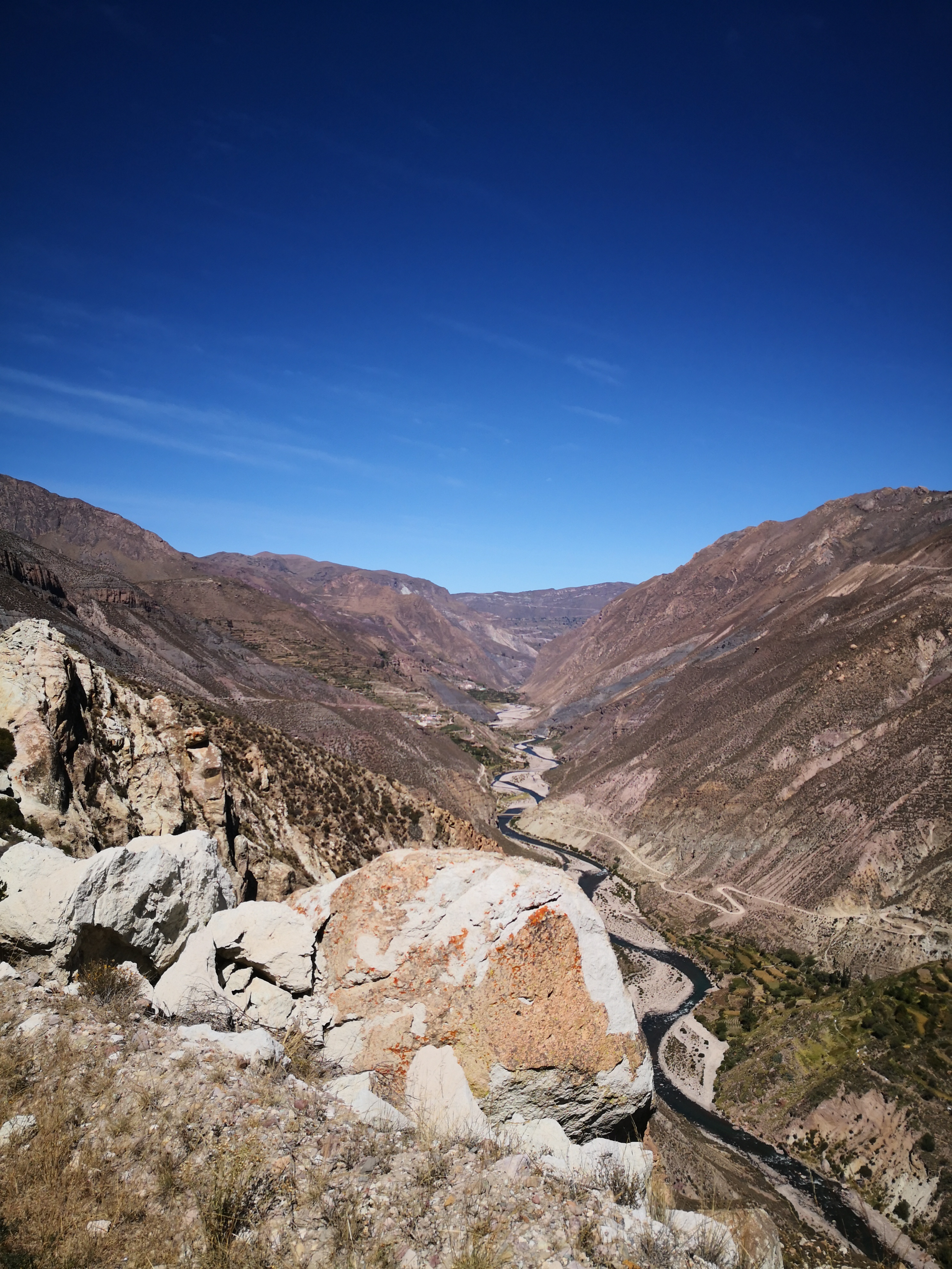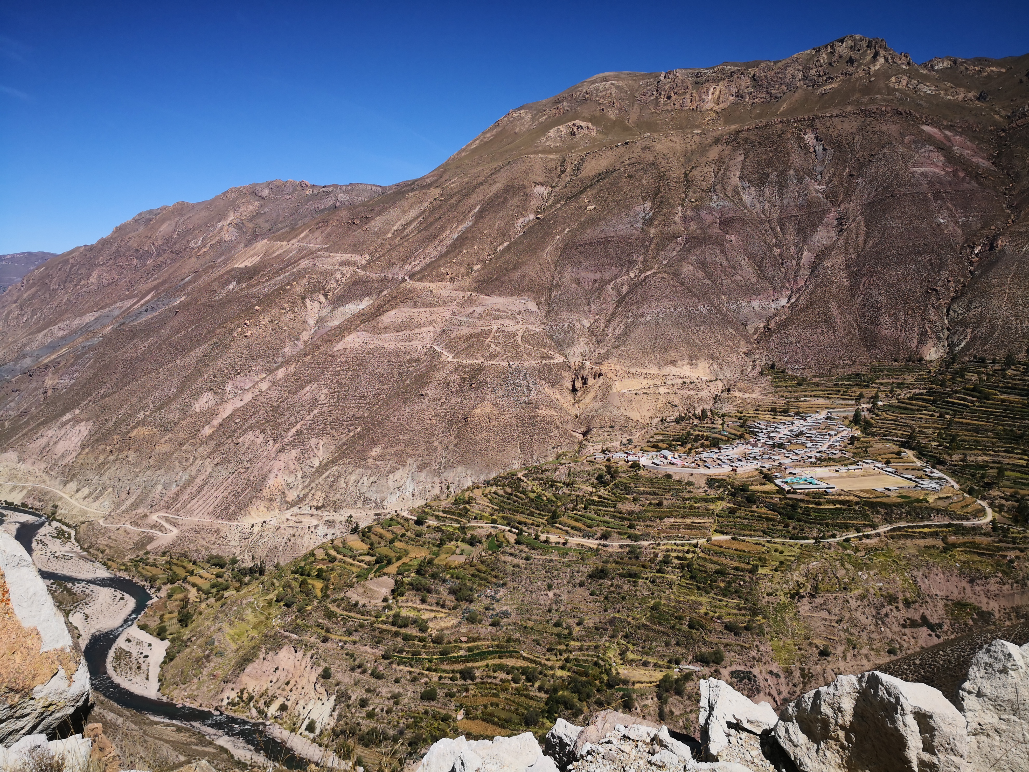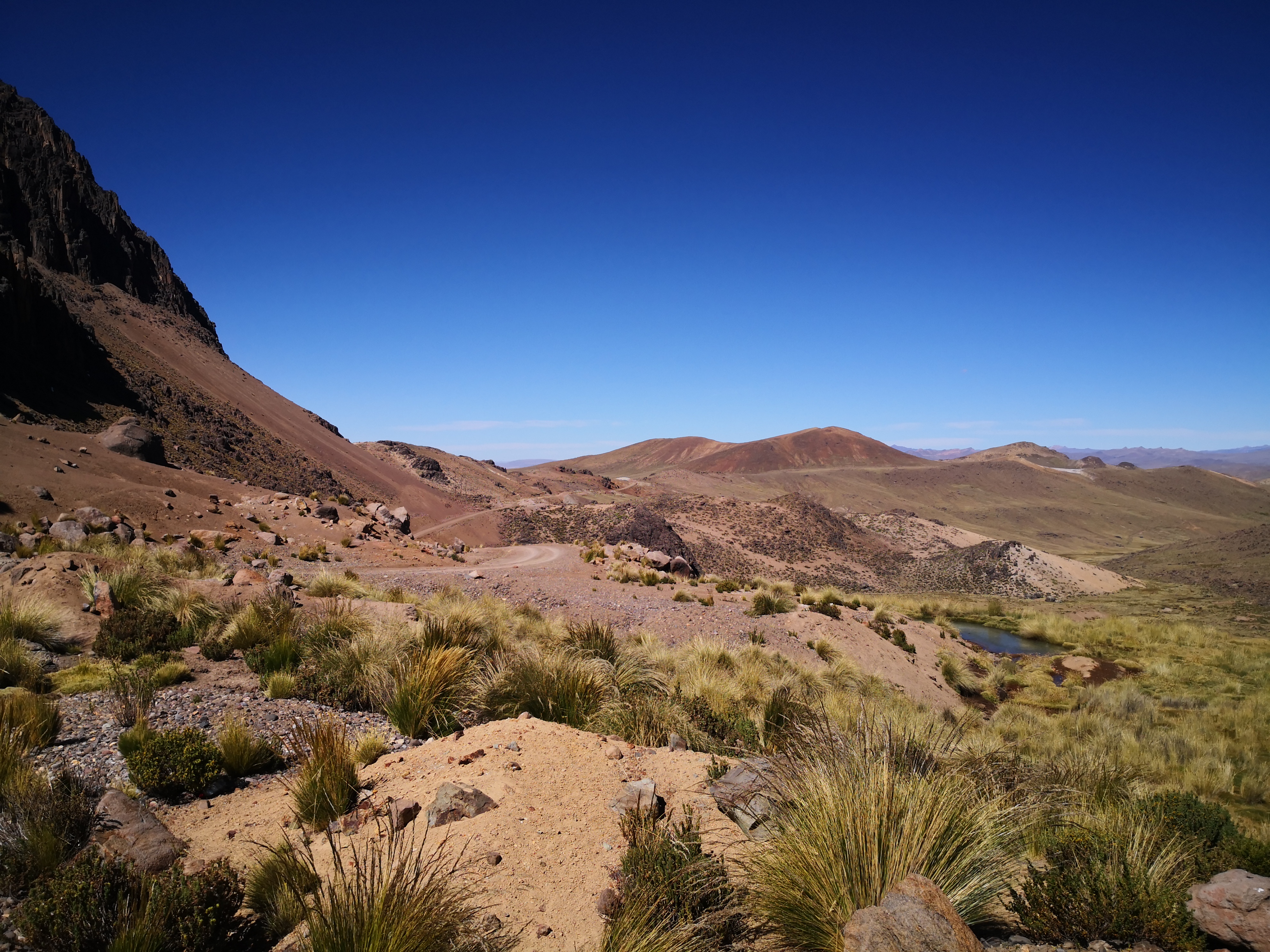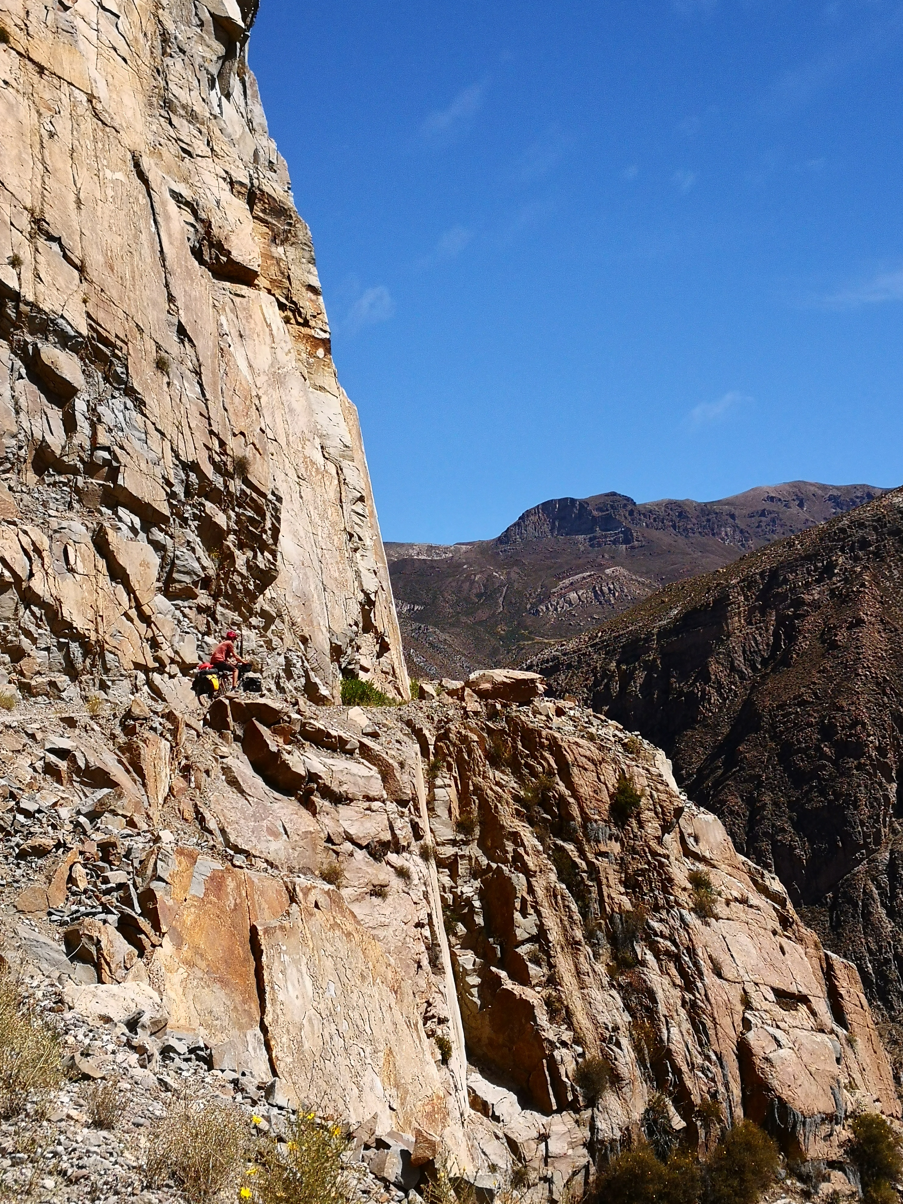 La descente se fait sur un chemin caillouteux de bonne facture, et nous nous retrouvons rapidement à nouveau à des altitudes raisonnables, où le climat y est plus agréable. Nous faisons étape au petit village de Juncal, où notre arrivée est remarquée, en témoigne la visite dans notre chambre d’hôtel d’une employée de la municipalité, venue faire une interview de notre périple. Puis, le lendemain, nous enfourchons nos vélos à la découverte de la région d’Ichuña. Nous sommes alors plongés dans des gorges où coule une petite rivière aux eaux turquoises bordée par diverses cultures de maïs, blé et figues de barbarie. Alors que nous avançons sur ce sinueux chemin à flanc de coteau, à contempler les multiples parcelles aménagées en terrasse sur chaque rive du cours d’eau, Antoine se voit contraint à poser pied à terre. Cette fois-ci, ce n’est pas une crevaison mais une chaîne cassée qui nous pousse à sortir notre trousse à outils. Heureusement, notre expérience en mécanique du vélo étant maintenant confirmée, il ne nous faudra que quelques petites minutes pour résoudre ce soucis, le temps d’enfiler un maillon rapide. Nous continuons alors notre visite des gorges sur un rythme paisible, où les jours défilent en même temps que nous longeons le Rio. Nous profitons de ces étapes agréables afin de reprendre des forces suite à « l’épreuve du mur », et hormis quelques crevaisons, devenues monnaie courante, nous arrivons à Yalagua, point de départ d’un nouveau col d’envergure.