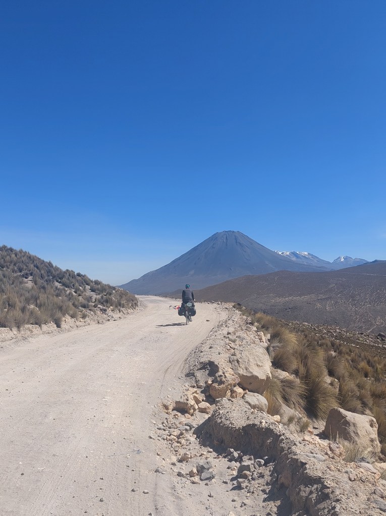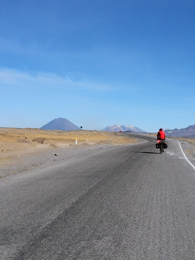Dans de telles circonstances, nous ne faisons pas vieux os au moment de se remettre en route, et sommes contraints à rouler à une allure soutenue afin de chauffer nos corps et de lutter contre l’air glacial qui transperce nos membres. Les conditions sont loin d’être agréables mais les paysages sont sublimes. Devant nous commencent à se dessiner les deux volcans Misti et Chachani, porte d’entrée de la ville d’Arequipa située quelques 2000 mètres plus bas et dont son climat nous fait rêver.