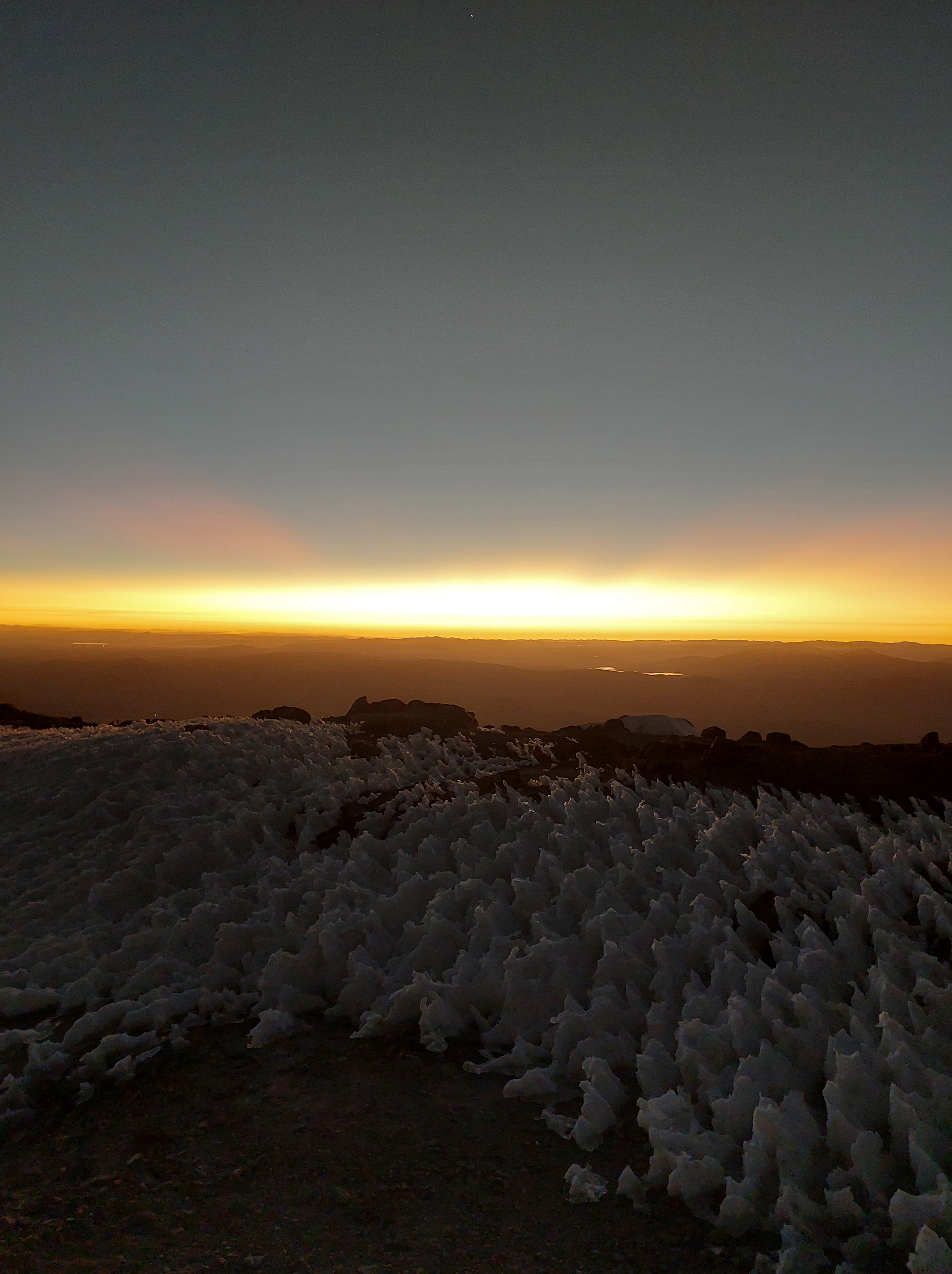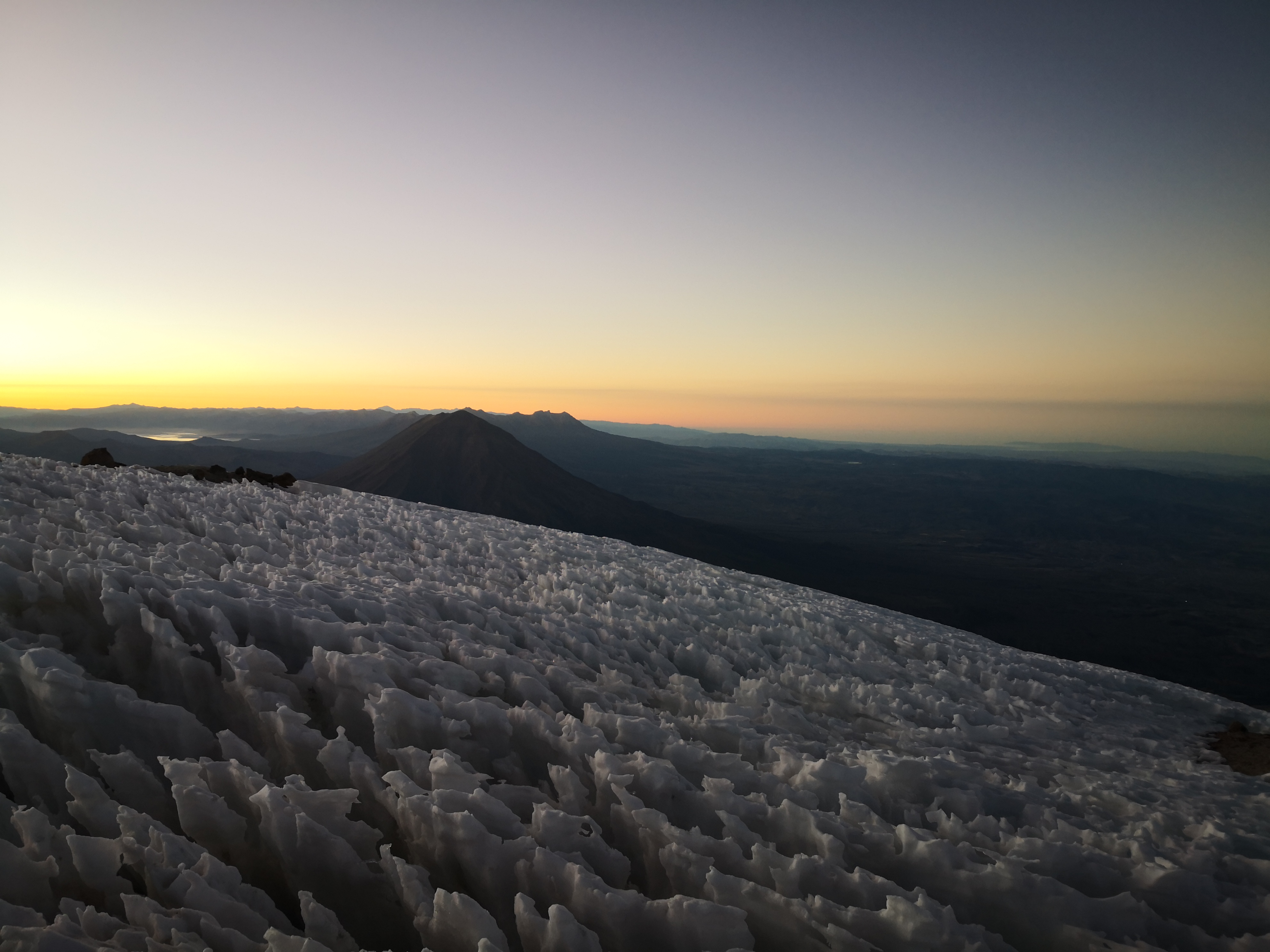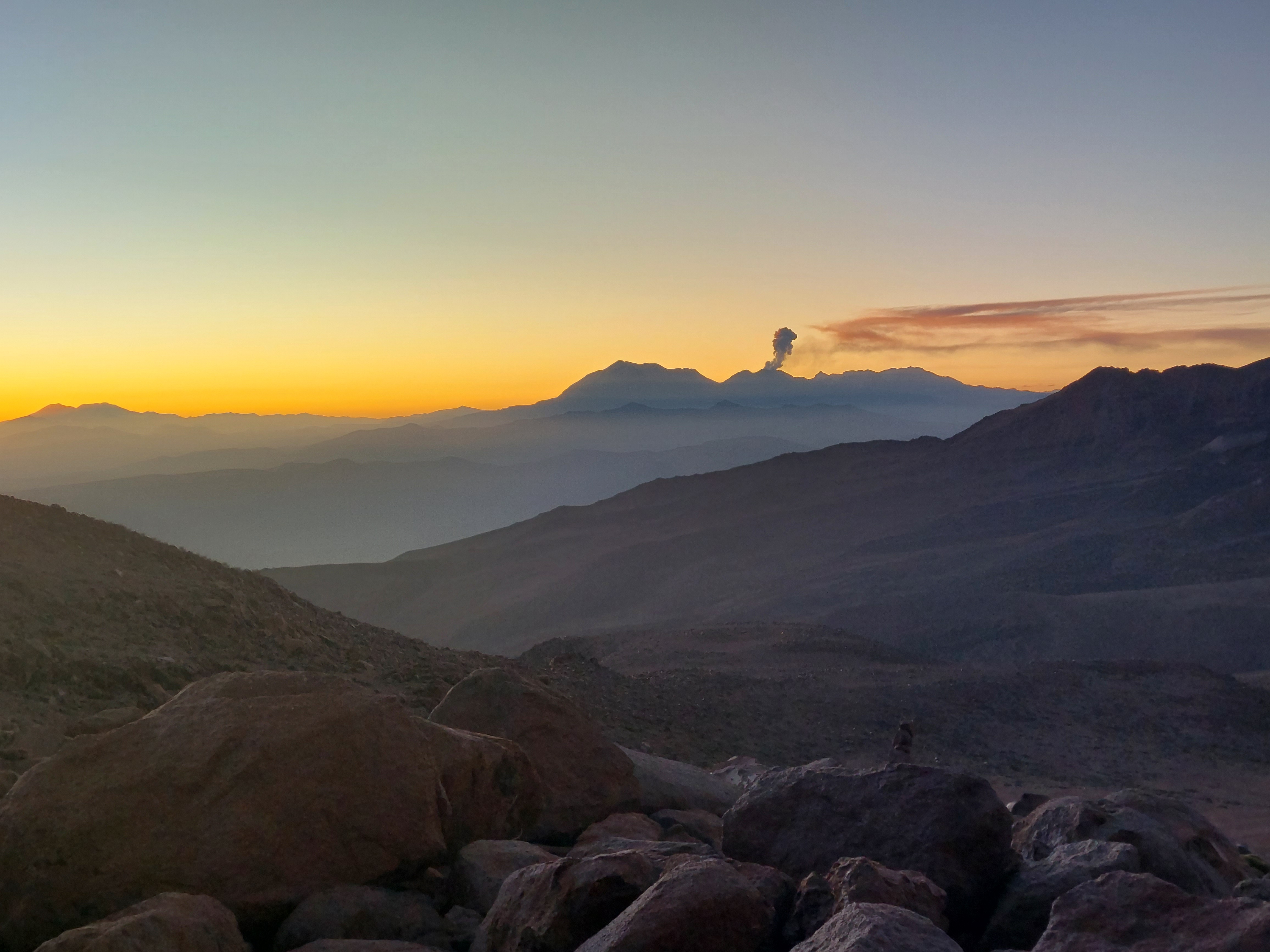 Nous nous octroyons alors quelques heures de repos puis débutons l’ascension finale au milieu de la nuit, où seules nos lampes frontales nous éclairent. La montée s’effectue à un rythme très lent afin de ne pas manquer d’oxygène, l’air étant très peu dense à de telles hauteurs. Une fois à proximité du sommet nous apercevons en contrebas, à quelques 3500m en dessous de nous, les lumières de la ville qui est encore bien endormie. Arrivés en haut, les sensations sont grandioses. Nous assistons à l’apparition des premiers rayons de soleil et même si au vu du spectacle, nous pourrions rester là des heures, le vent glacial qui se lève aura vite fait de nous encourager à quitter les lieux. Un dernier regard sur le volcan Misti qui nous fait face, sur l’altiplano, les Salinas et le volcan Ubinas qui nous ont accompagné tout au long de la semaine, et nous attaquons la descente. Nous regagnons alors en milieu d’après midi notre chambre d’hôtel et nous écroulons comme des masses sur nos lits jusqu’au lendemain.