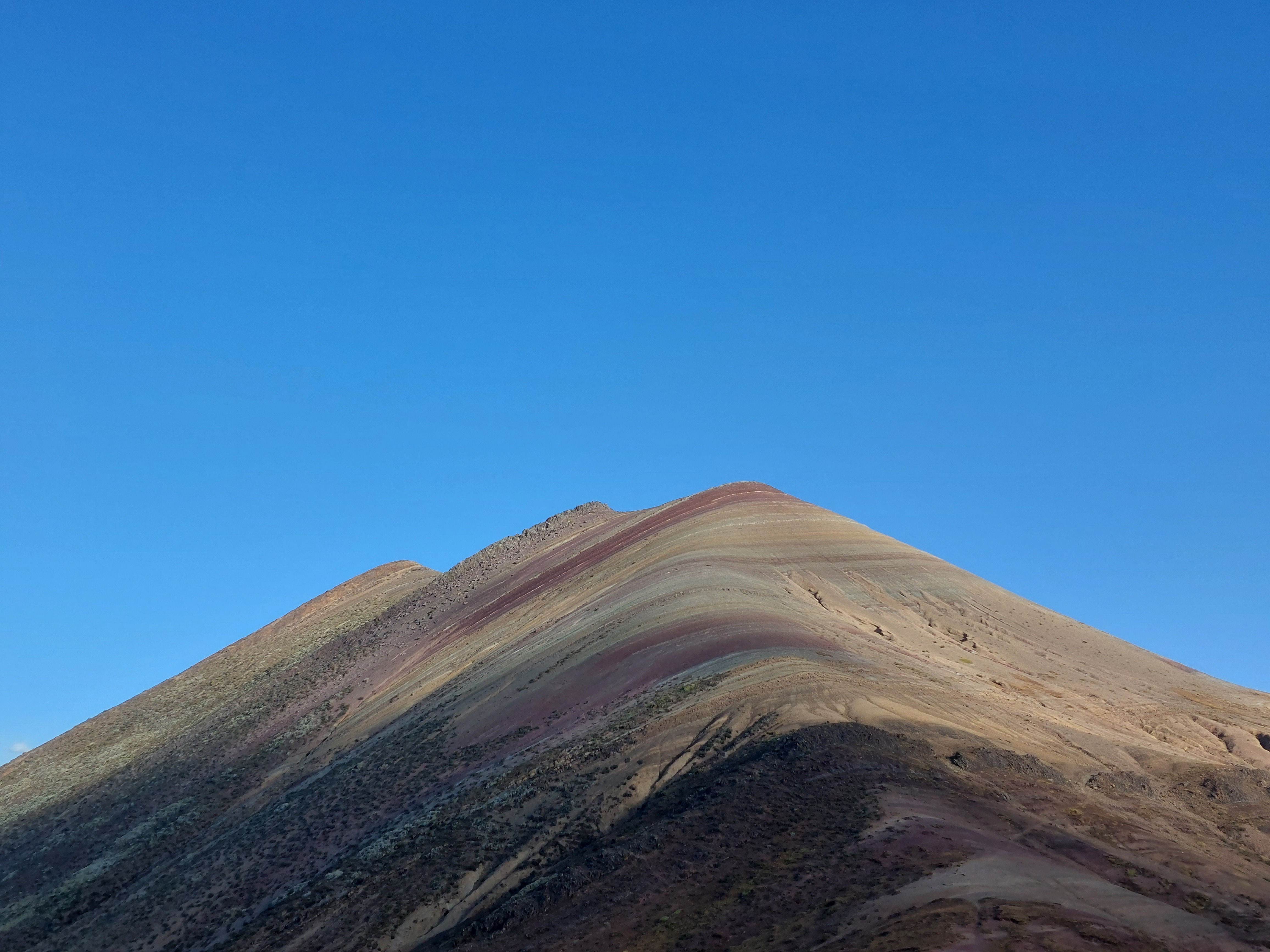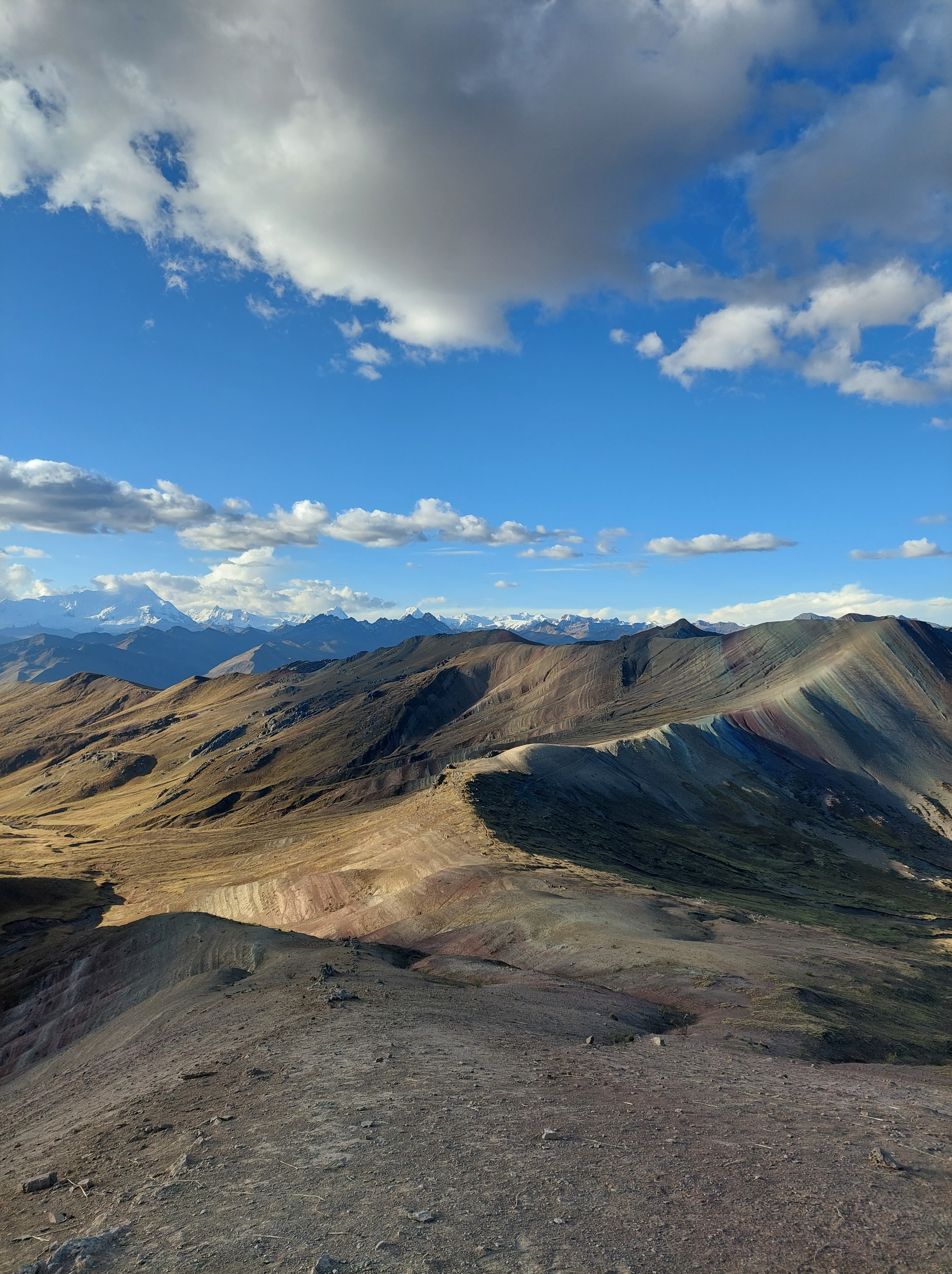 Nos vélos bichonnés et nos corps reposés, nous sommes prêts à quitter Arequipa. Pour ce faire, nous prenons un bus jusqu’à Sicuani, d’où nous roulons en direction de Combapata et des fameuses montagnes Arc-en-ciel, qui se visitent à pied après avoir emprunté un minibus sur une route de montagne en piteux état. Nous arrivons alors en fin de journée dans un décor splendide avec en premier plan des sommets multicolores, un peu plus loin des collines rougeâtres et en arrière plan, les magnifiques sommets enneigés de la Cordillère des Andes.