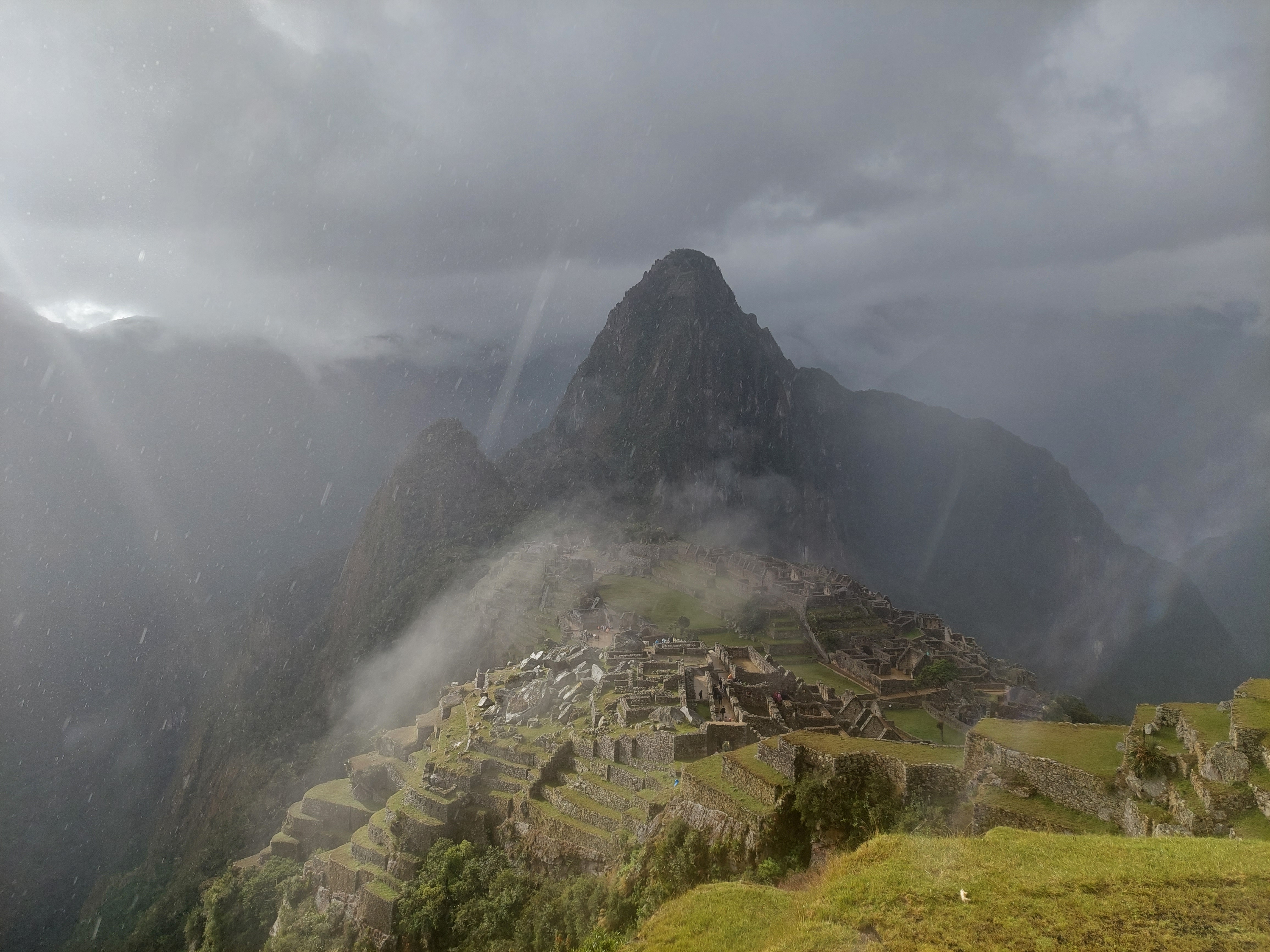Une fois en haut, nous nous octroyons une pause afin de faire sécher notre transpiration et d’avaler notre pic-nic. Mais rapidement, le ciel se couvre et de petites gouttes se mettent à tomber du ciel. Nous nous mettons à l’abri dans l’idée de laisser passer cette pluie passagère. Nous savons qu’ici, en raison du vent et de l’humidité ambiante de la région, le climat peut changer très vite, c’est pourquoi nous avons espoir que d’ici peu, le soleil refasse son apparition. Mais alors que nous terminons notre sandwich, la pluie s’est intensifiée et ce sont désormais des trombes d’eau qui tombent du ciel. Ayant un timing serré à respecter, nous ne pouvons plus attendre davantage et enfilons alors nos vestes de pluie et commençons à faire la file d’attente. A peine entrés dans l’enceinte sacrée que nous sommes déjà trempés jusqu’à l’os ; nous réalisons à ce moment que nos vestes imperméables ont quelque peu perdu de leurs capacités… De là commence une course contre-la-montre de point de vue en point de vue afin de visiter la cité le plus rapidement possible, en essayant d’immortaliser ce moment malgré la buée et les gouttes d’eau présentes sur nos capteurs d’appareils photos.