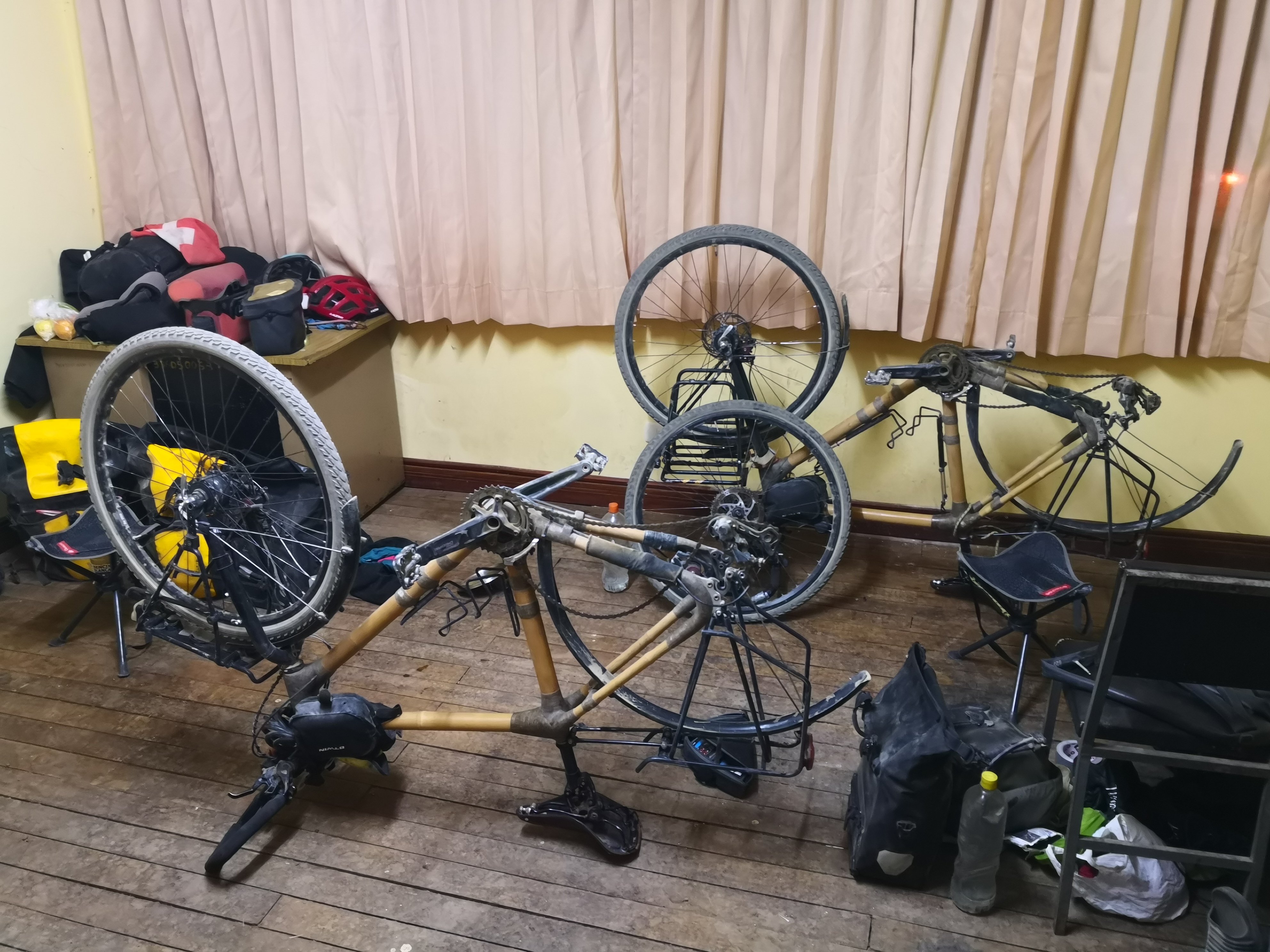 Le calme de la région contraste avec les vibrations incessantes que subissent nos corps et vélos en empruntant ces chemins en état lamentable, ce qui nous contraint à effectuer plusieurs réparations sur nos chambres à air. Le soir venu, nous sommes bien émoussés par cette éprouvante journée, et nous nous réjouissons d’une bonne nuit de repos dans le calme de l’altiplano péruvien. Si le premier village que nous traversons est désert et ne présente aucune offre de restauration ou d’hébergement, on nous indique un second pueblo non loin de là, où nous décidons d’aller tenter notre chance. Cette fois-ci, le hameau est bel et bien animé, et c’est un euphémisme ! Tout le village est en fête, hommes et femmes vêtus d’habits traditionnels dansent au rythme de la musique folklorique proposée par l’orchestre du coin, le tout en enchaînant sans modération des verres de Cusqueña. Nous profitons alors des derniers rayons de soleil afin s’imprégner de cette ambiance festive et d’échanger avec les habitants tout étonnés de nous voir débarquer ici avec nos drôles de vélos. L’un d’eux est le responsable des locaux municipaux du village, et nous offre alors une petite pièce dans l’un des bâtiments afin que nous puissions nous y établir pour la nuit. Cependant, et comme vous pouvez vous y attendre, dormir au centre du village animé par la seule fête de l’année n’est pas chose aisée. Nous ressortons alors nos bouchons d’oreilles et tentons tant bien que mal de fermer l’œil, bercés par le son des haut-parleurs de la petite scène située juste sous nos fenêtres…