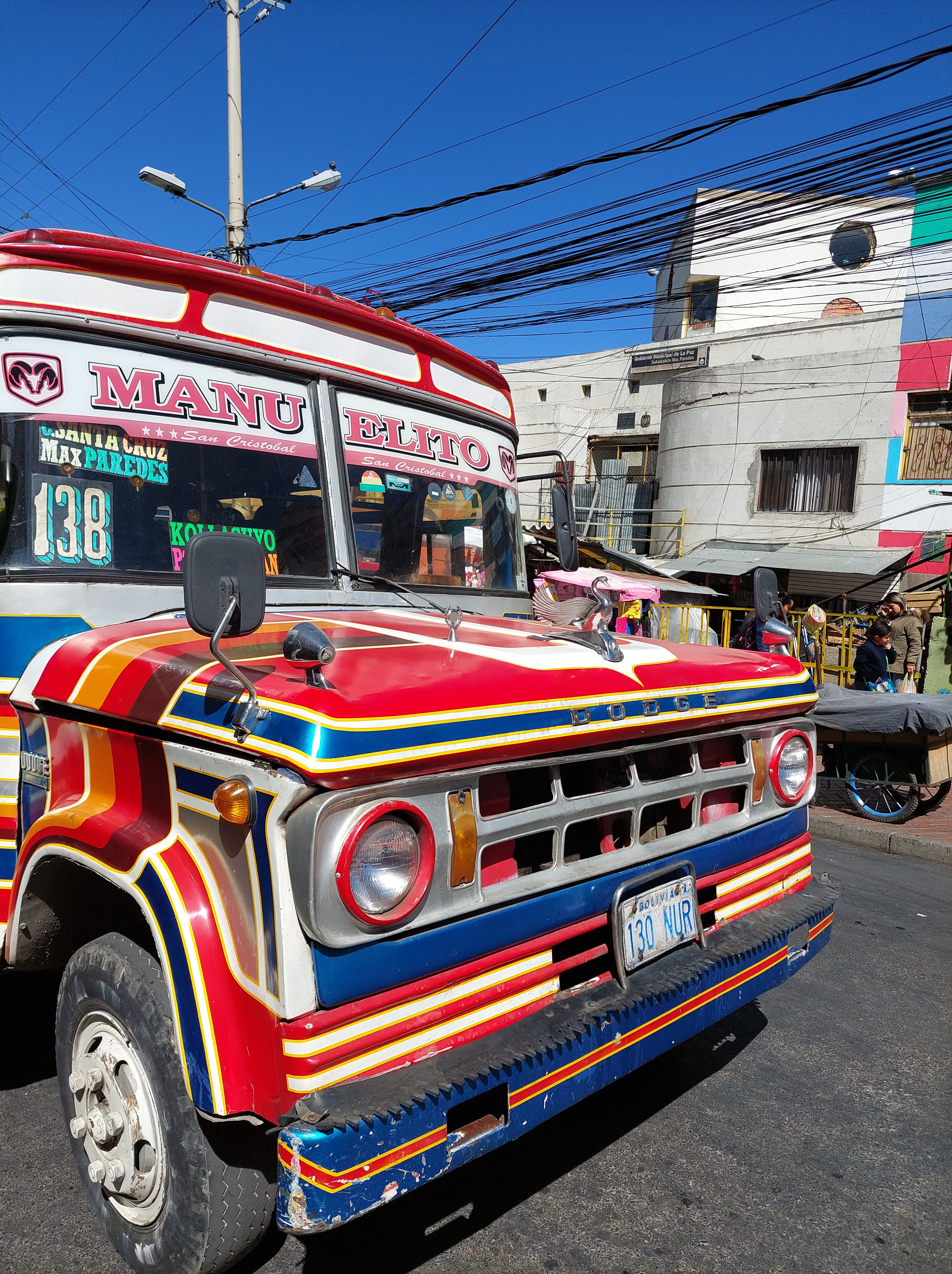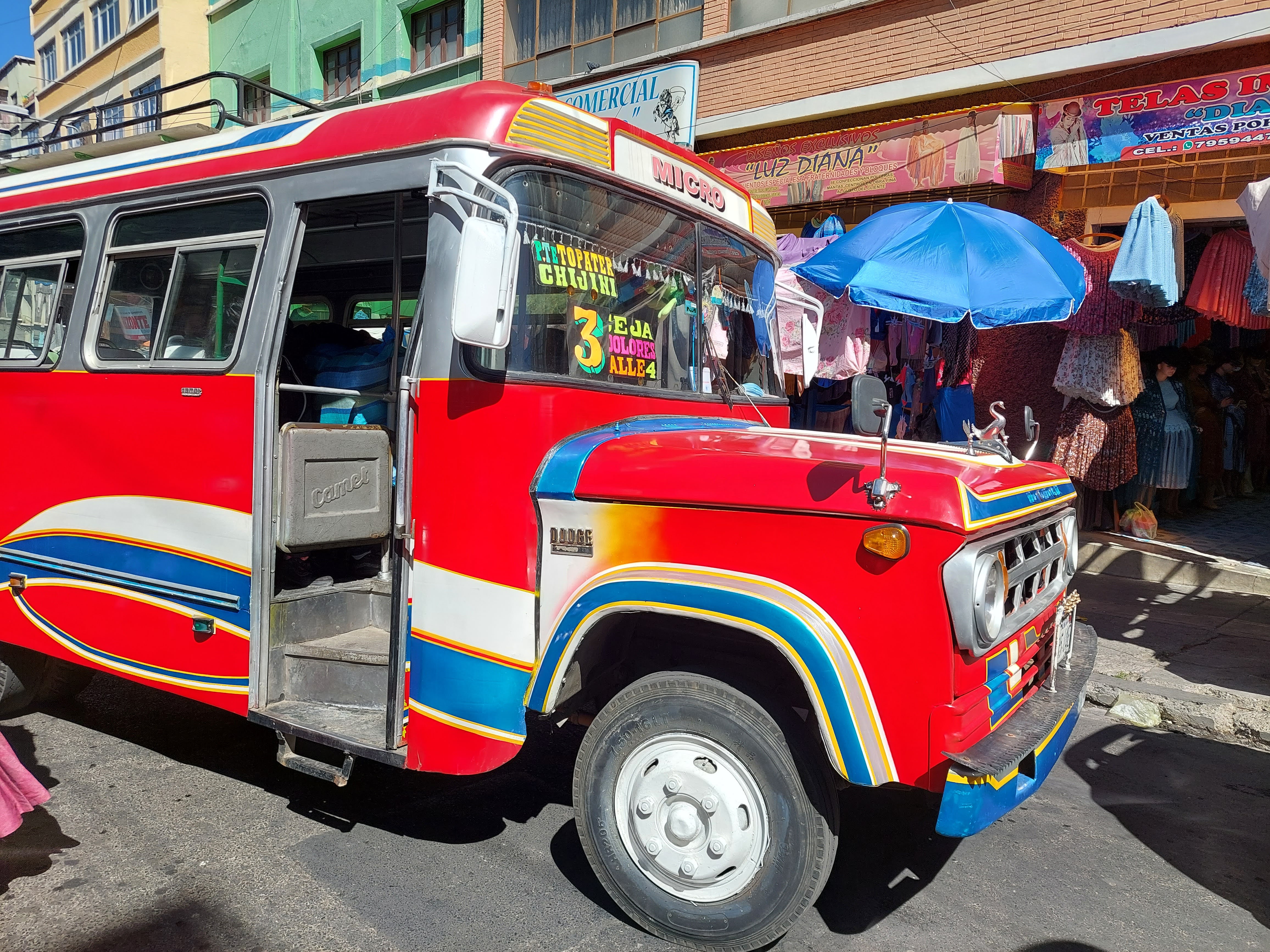 Une douzaine d’heures de bus séparent la petite ville d’Uyuni de la capitale administrative du pays, La Paz. Le trajet se faisant de nuit, nous ne pouvons pas profiter des paysages qui se trouvent entre les deux villes, mais les incessants virages, montées, descentes, dos d’ânes et nids-de-poule en disent déjà bien assez sur la nature des régions traversées ! Nous rejoignons le terminal de bus de La Paz à environ 5h du matin, et même si la ville est encore quelque peu endormie, le contraste avec le calme du Salar d’Uyuni est flagrant. Finis les bucoliques hôtels de sel et les vastes plaines inhabitées, place aux grands immeubles bétonnés collés les uns aux autres et un brouhaha incessant. Si les quartiers environnants les terminaux de bus ne sont, en règle générale dans les métropoles sud-américaines, jamais les lieux les plus sympathiques pour s’y établir, nous décidons cette fois-ci exceptionnellement de déroger à cette règle. En effet, la densité du trafic et le chaos global, malgré cette heure matinale, ne nous donnent guère envie de s’aventurer à vélo dans le rues de la ville. De plus, les nombreux virages (ou les côtelettes de lama de la veille) ont eu raison de l’estomac d’Antoine, et nous nous dirigeons alors vers l’hôtel le plus proche afin qu’il s’offre un répit nécessaire.