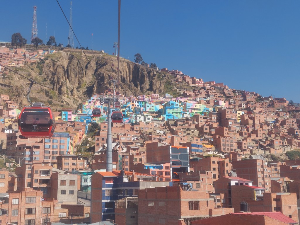 Nous profitons de ces instants de repos afin d’établir un programme pour ces prochains jours. Depuis le début du voyage, nous ne nous sommes jamais adonnés à la visite d’agglomérations, préférant barouder dans les plaines et les montagnes isolées, où nous pouvons pleinement profiter des paysages sauvages. Cette fois-ci, c’est tout différent : La Paz a réellement un aspect intrigant et ne rentre pas dans le rang des autres métropoles que nous avons brièvement traversé. Nous nous octroyons alors environ une semaine à visiter la ville, ses multiples marchés et ses environs avant de reprendre la route en direction du Lac Titicaca. Nous laissons alors nos vélos au repos le temps de cette semaine et partons à l’assaut des différents quartiers de la ville, qui a la particularité de posséder un vaste réseau de télécabines reliant les différentes zones de l’agglomération. En effet, les dénivelés étant importants (plus de 1000 mètres de différence entre le centre, en bas, et la banlieue, en haut) et les routes étant saturées par le trafic, ce moyen original de transport publique permet aux habitants de se déplacer rapidement au sein de la ville. De plus, le coup d’œil depuis la cabine sur la ville et ses environs en a fait une attraction touristique particulièrement appréciée.