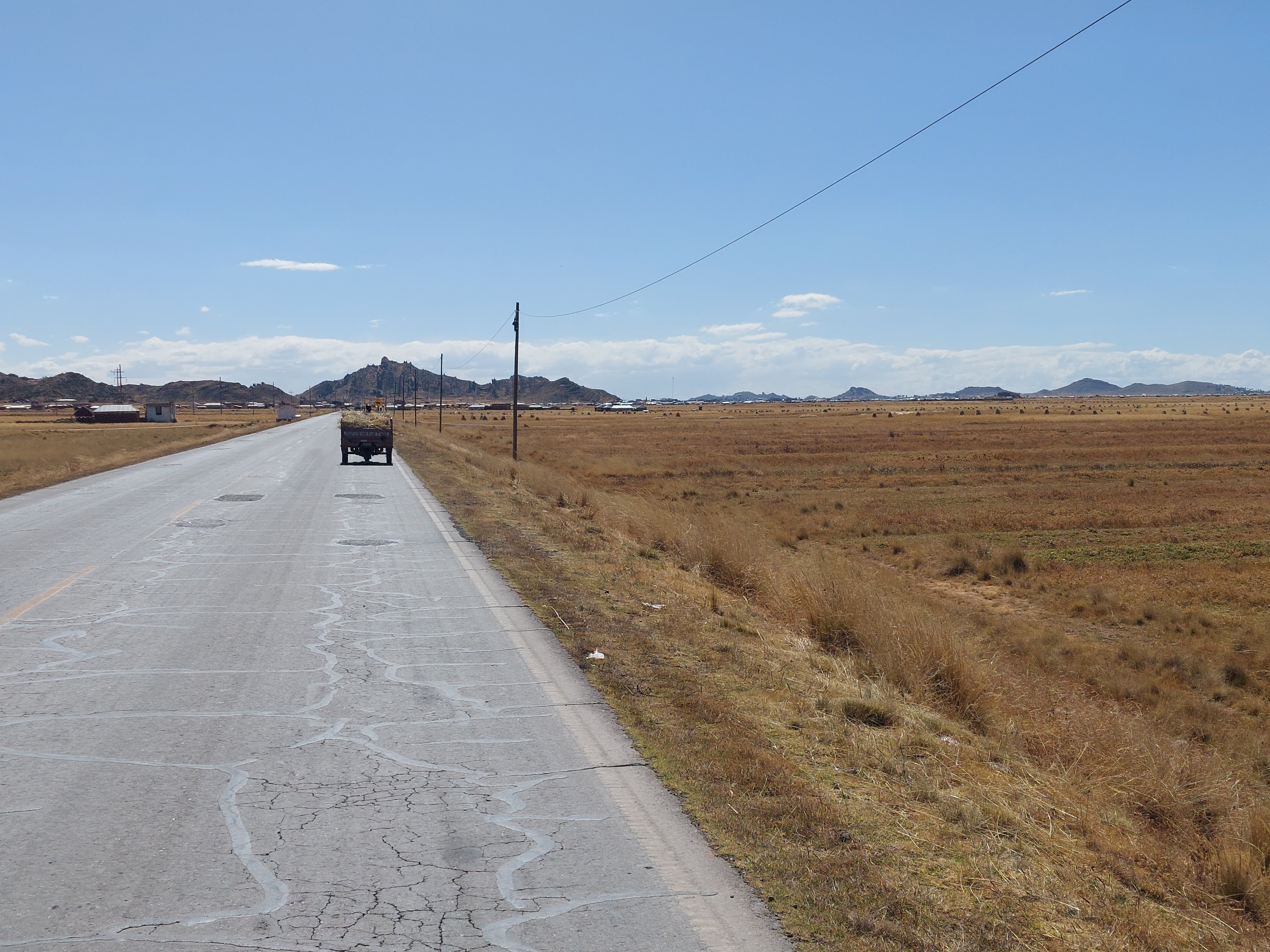 De retour à la civilisation, nous rassemblons nos affaires et nous préparons à quitter la ville, qui nous aura offert son lot d’aventures et de surprises. Nous empruntons une dernière fois le réseau de télécabines, cette fois-ci avec nos vélos, afin de s’extraire du centre-ville situé dans une cuvette, et de rejoindre El Alto, sur l’altiplano en périphérie de La Paz. De là, nous nous mettons en selle et rapidement la civilisation et le trafic disparaissent laissant place à de vastes cultures de céréales. Si le faux plat montant et le vent de face rendent notre avancée pénible, que dire alors des routes occupées par des cortèges festifs défilant en habits traditionnels, et des barrages routiers mis en place clandestinement par des communautés locales en colère, à peine quelques kilomètres plus loin ? Ce lot de découvertes surprenantes a le mérite de rythmer notre journée, et c’est ainsi que nous rejoignons le petit village d’Achacachi, aux abords du Lac Titicaca. Là-bas, nous sommes accueillis par Milton, notre hôte Couchsurfing qui, à notre grande surprise, est également le propriétaire de la piscine municipale ! Quel plaisir de pouvoir se relaxer dans les saunas et se détendre dans le grand bassin après une journée de vélo.