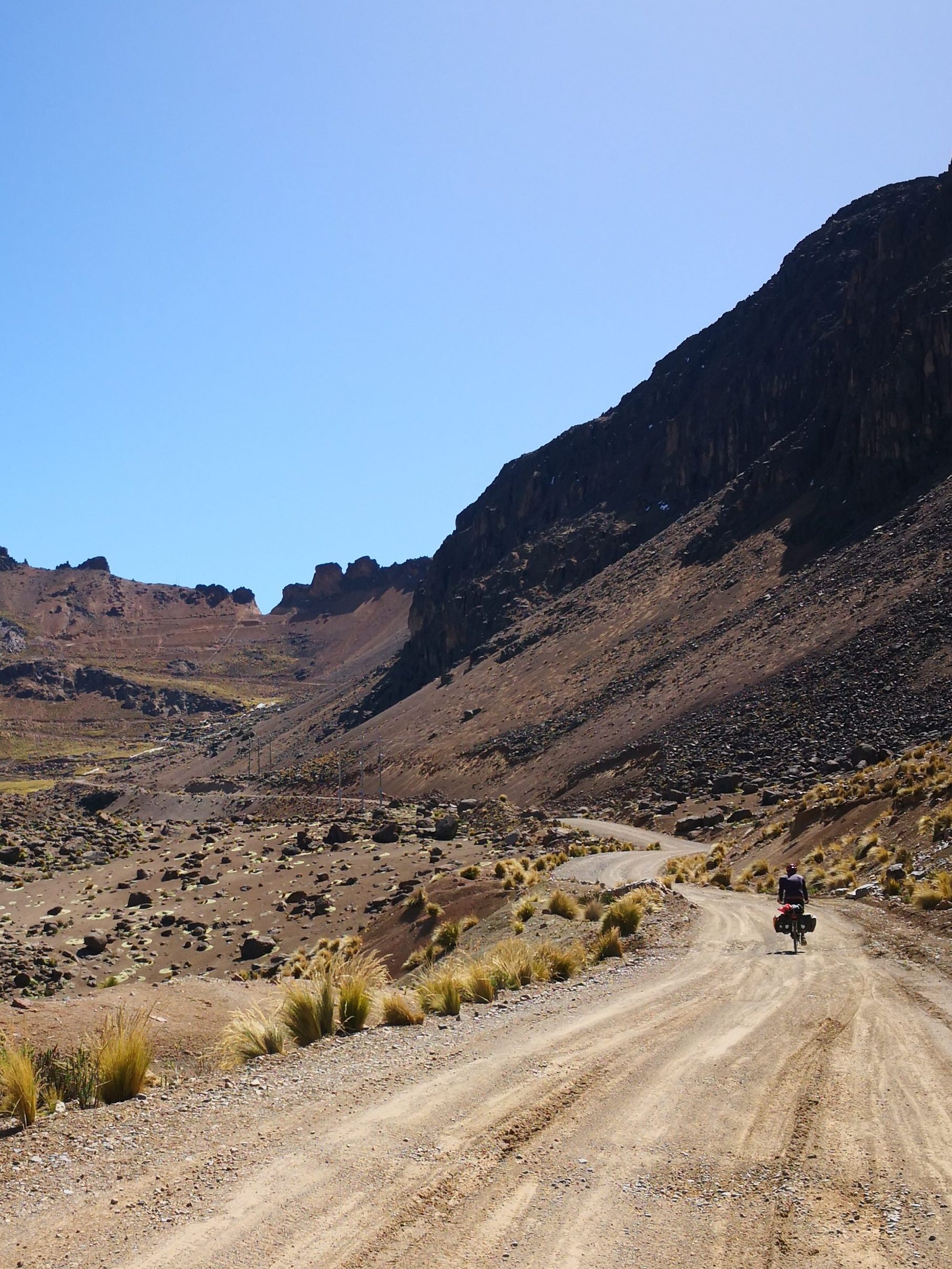 Le lendemain, nous nous réveillons aux aurores avec comme but de franchir un col à presque 5000 mètres d’altitude. L’entame se fait en douceur, la pente est modérée et régulière, ce qui nous permet de bien se mettre en jambe. Nous poursuivons notre ascension dans ces conditions, satisfaits de notre forme physique, et soudain la route s’aplanit ! Sommes-nous déjà au sommet ? Un rapide coup d’œil sur notre GPS nous informe qu’il reste encore près de 300 mètres de dénivelé à parcourir. Nous avalons alors cette portion plate en un rien de temps et à la sortie d’un virage, nous apercevons finalement le sommet du col. Hélas, il n’est là plus question de pente douce et agréable, nous faisons face à un mur. Un mur, oui ! Nous sommes à 4700 mètres, déjà bien émoussés par trois longues heures de montée, et voici que se dresse face à nous un flanc de montage paraissant totalement vertical, où slalome une route aux lacets sinueux devant nous mener à presque 5000 mètres. L’obstacle est de taille, le serons-nous également ?